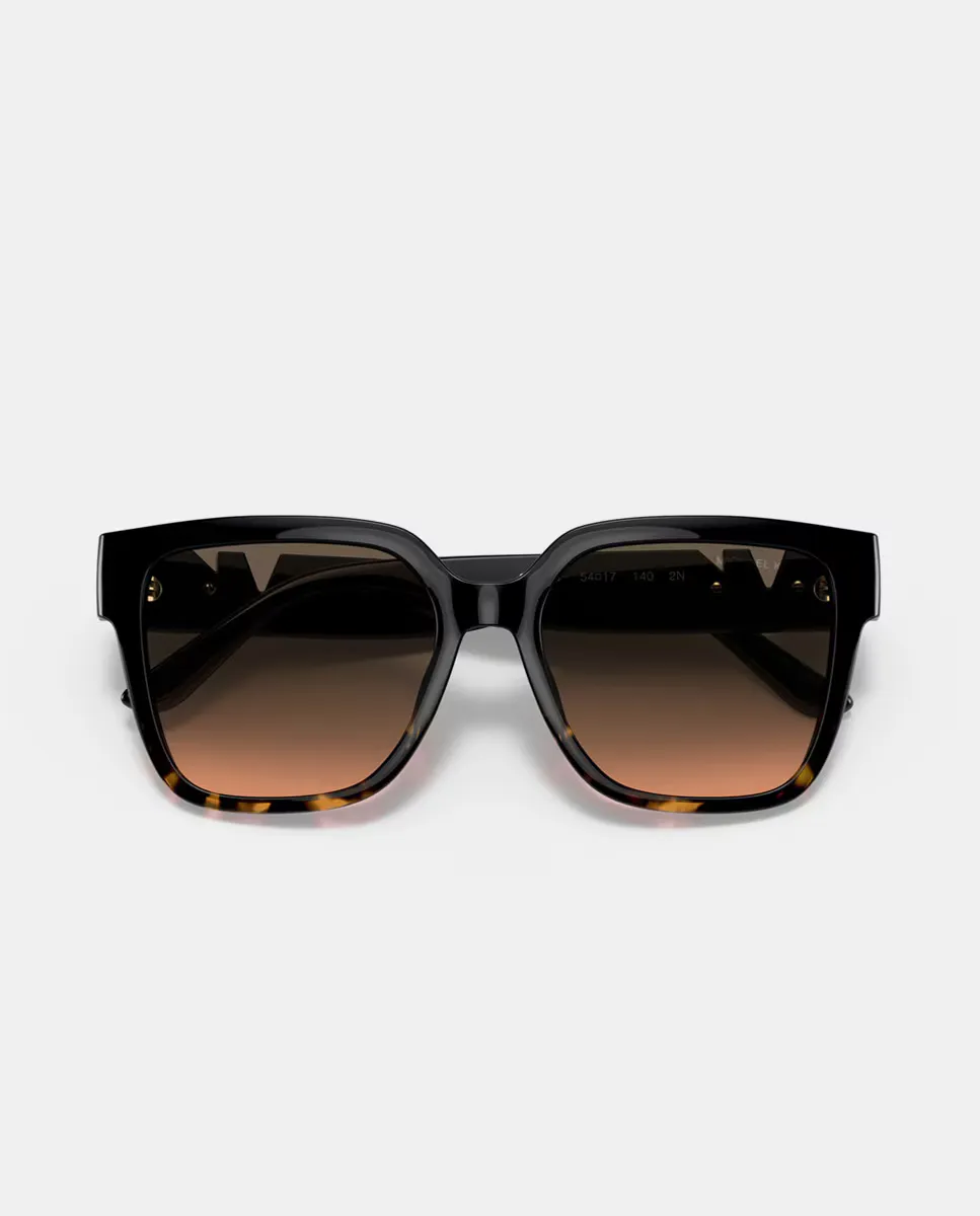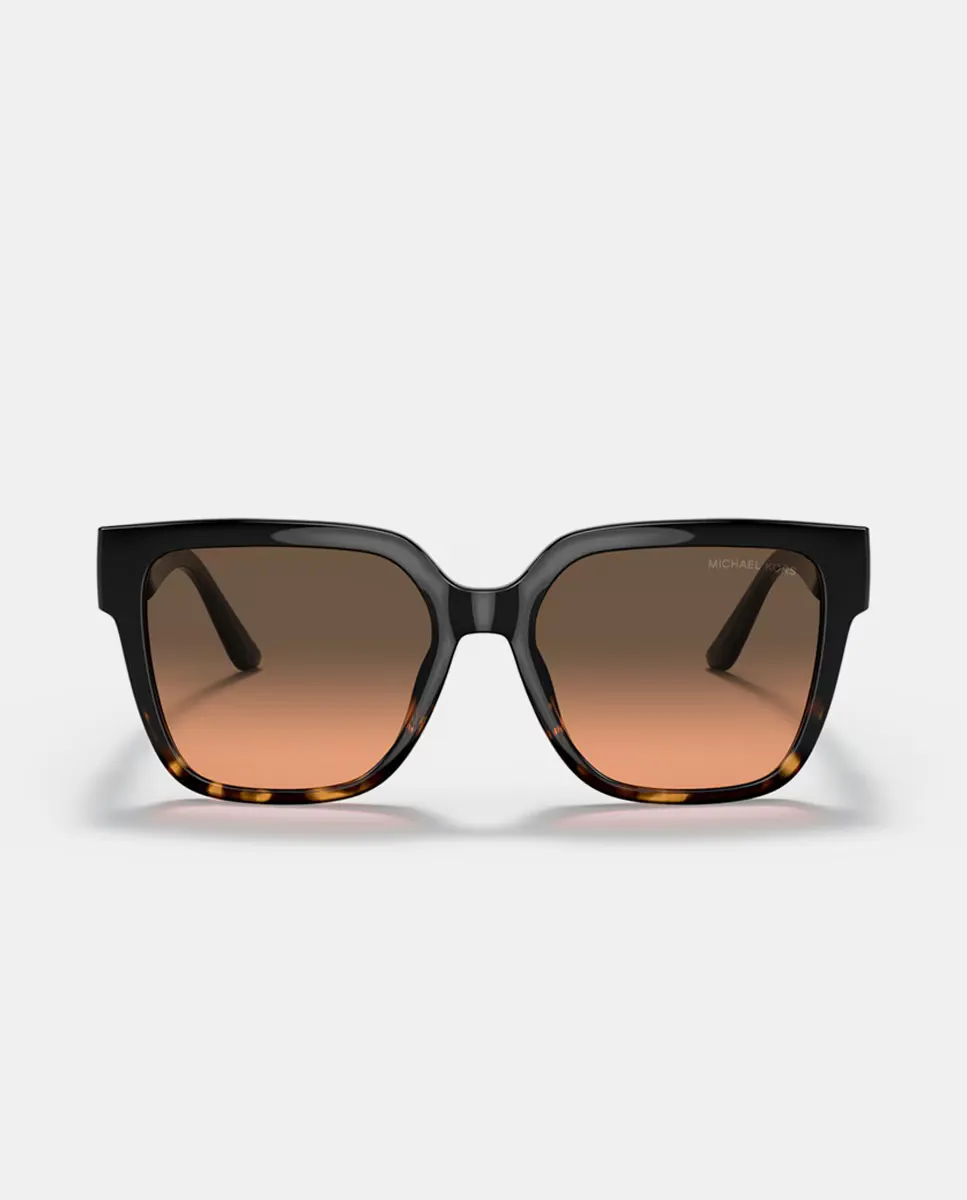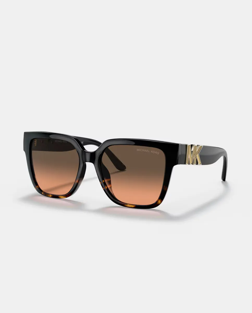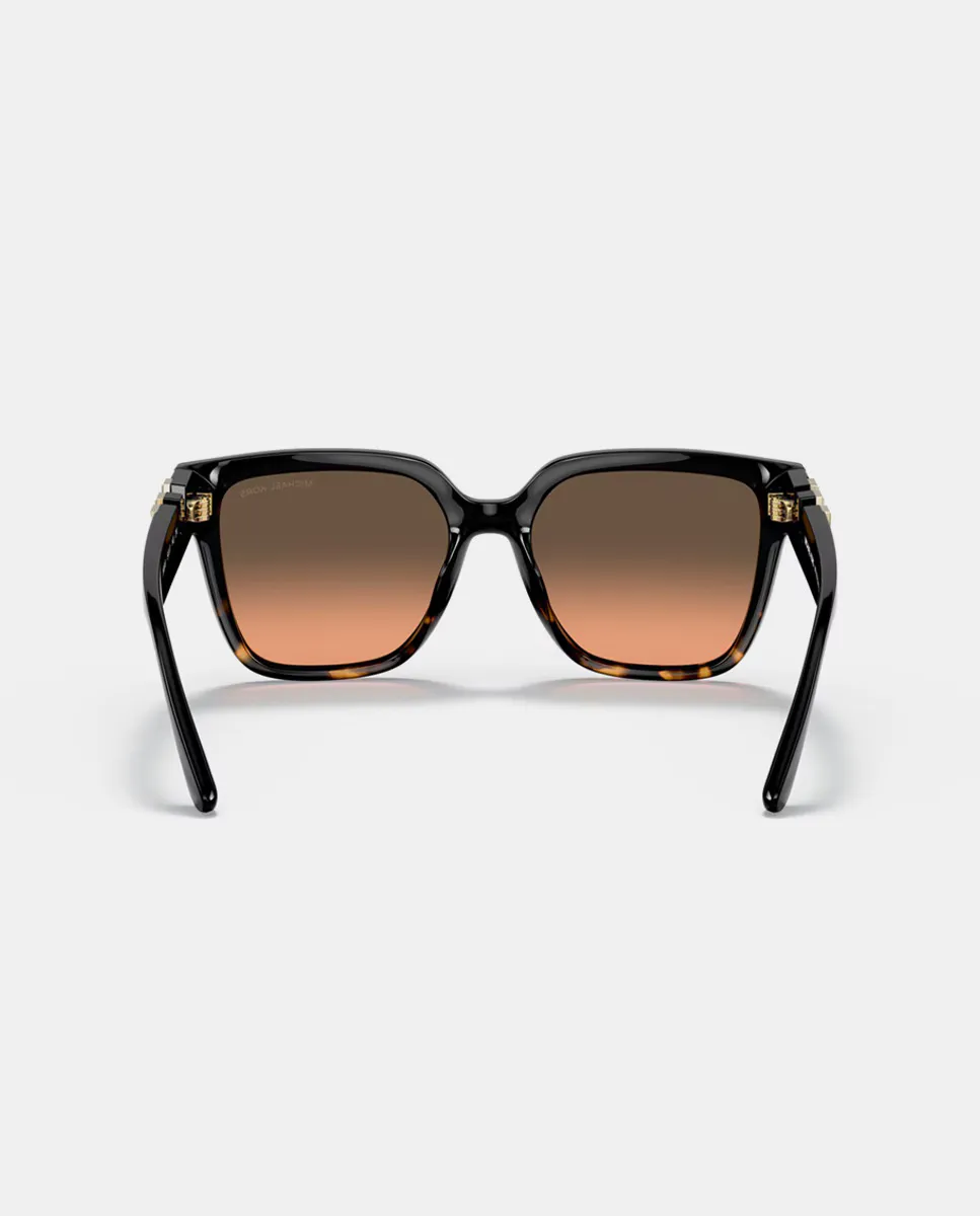 Солнцезащитные очки модель 0MK2170U с квадратной черной оправой с золотыми вставками на дужках и градиентными оранжевыми линзами.