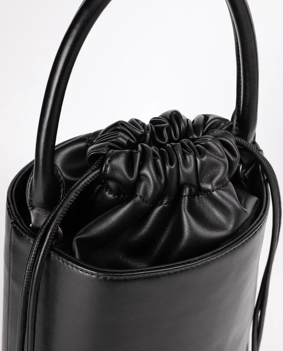 Мягкая однотонная сумка-куб. Модель оснащена ручкой и регулируемым, съемным плечевым ремнем, а также верхним замком с завязками, завершенным металлическими наконечниками. Аксессуар украшен металлической пластиной с логотипом на передней части. Длина 22 см x Высота 24 см x Ширина 14 см.