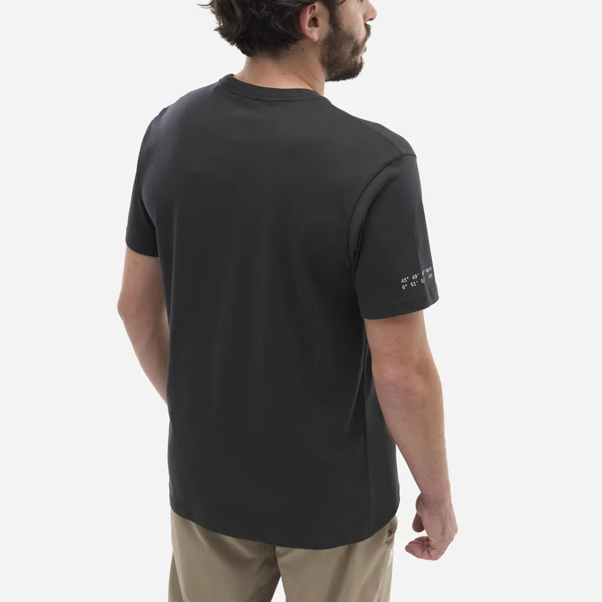 Эта экокампания футболка изготовлена в Европе из 100% органического хлопка. Удобная для ношения каждый день, у нее есть карман на груди. Она демонстрирует логотипы Millet и Compagnie des Guides de Chamonix, подчеркивая их партнерство. Мы нашли координаты GPS Монблана на правом рукаве.