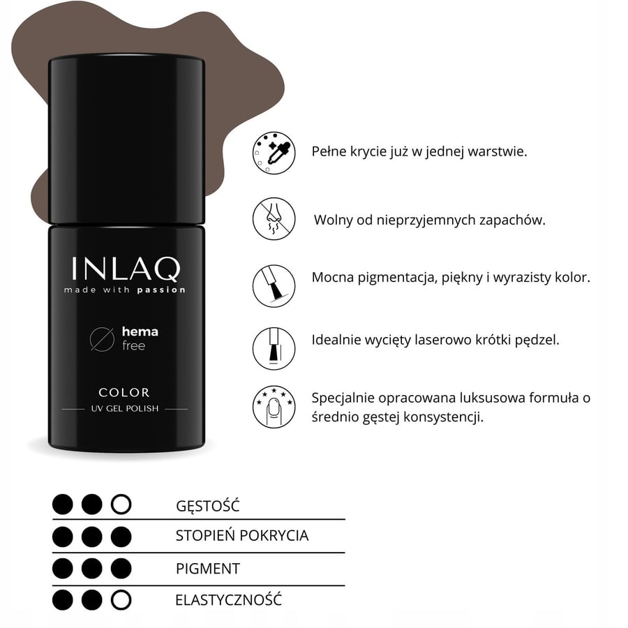 ». Коллекция, вдохновленная теплыми, глубокими оттенками шоколада. Эта уникальная цветовая палитра перенесет вас в мир роскоши и элегантности, идеально подходящая для любого случая — как повседневного, так и особого. Каждый цвет был тщательно подобран, чтобы отразить многообразие и богатство шоколадных тонов: от нежных бежевых до интенсивных, глубоких коричневых. Чем выделяются лаки для ногтей INLAQ? Эффективность - Высокопигментированная гелевая масса в наших лаках для ногтей тяжелее, чем во многих других продуктах, благодаря чему всего один слой лака эффективно покрывает ногтевую пластину. Простота использования - Нанесите тонкий слой гибридного лака на предварительно отвержденную основу и дайте затвердеть под лампой. Если вы хотите получить более интенсивный цвет, повторите процесс.
