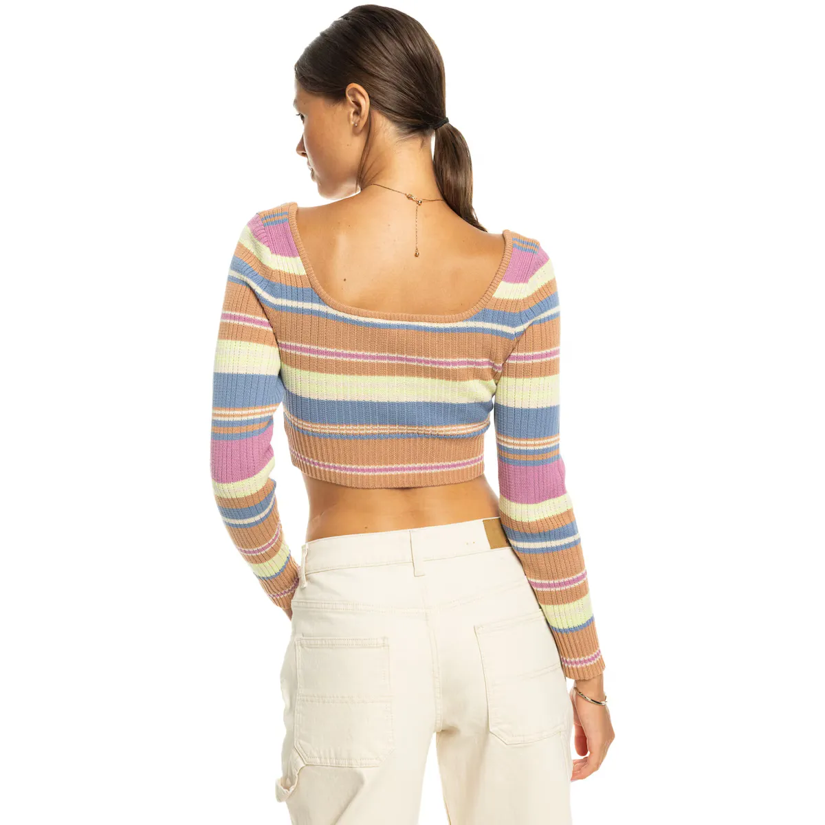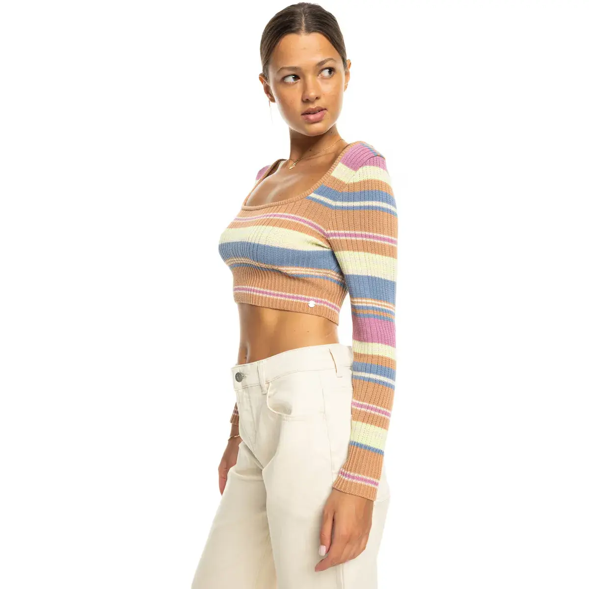 Обрезанный джерси для женщин. Характеристики включают: Ткань: хлопок средней плотности с полосами, окрашенными нитками. Прямой крой: приталенный. Длина: укороченный. Вырез: квадратный вырез спереди и сзади. Рукава: длинные рукава. Другие характеристики: неравномерное вязаное полотно.