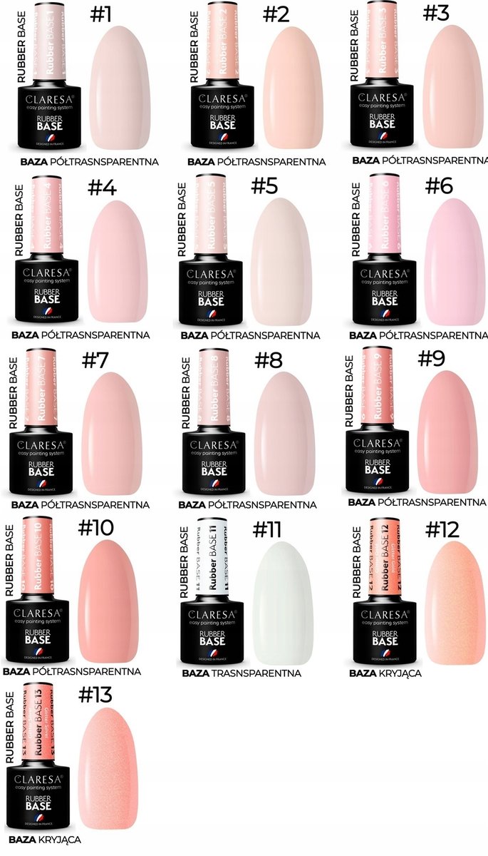 Каучуковая база CLARESA может использоваться как стандартная база для гибрида, с ее помощью можно нарастить поврежденный ноготь, выровнять неровности ногтевой пластины и выровнять цвет.