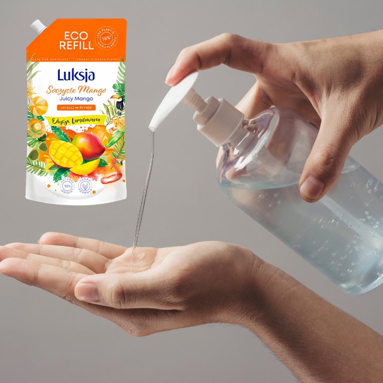 Luksja Жидкое мыло СОЧНЫЙ МАНГО 900 мл – Экологичный сменный блок, ограниченный выпуск Перенеситесь в тропики с Luksja Creamy Soft – кремообразным жидким мылом с экзотическим ароматом сочного манго. Идеальное сочетание эффективного очищения и ухода, которое сохранит вашу кожу увлажненной и гладкой каждый день.