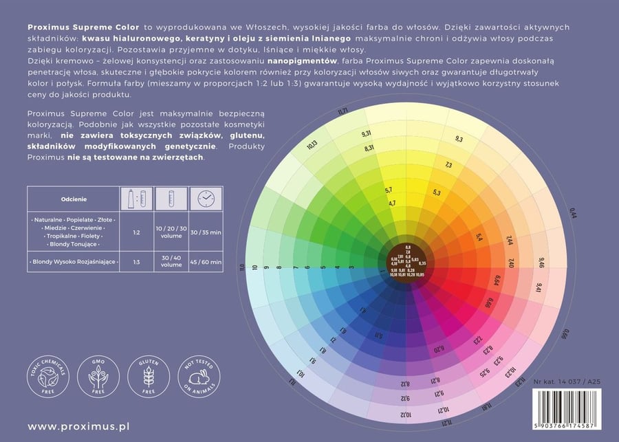 Мы рекомендуем использовать красители PSC с окислительными эмульсиями Proximus Cream Developer. В результате мы получаем смесь с правильной консистенцией (густотой) и соответствующим значением pH, благодаря чему волосы лучше впитывают краску, а краска легче распределяется по волосам. В результате мы получаем более глубокий и равномерный цвет по всей длине волос.