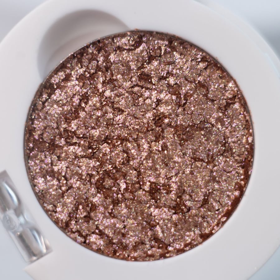 Блестящий прессованный пигмент холодного розового цвета, обогащенный сверкающими золотыми частицами.