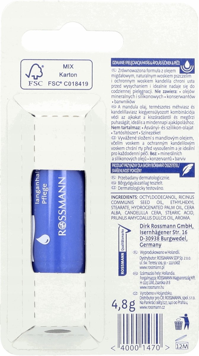 Классический защитный бальзам для губ с миндальным маслом. Длительный уход. Сбалансированная формула с миндальным маслом, натуральным пчелиным воском и защитным канделильским воском защищает губы от высыхания и идеально подходит для ежедневного ухода. Не содержит минеральных или силиконовых масел, консервантов и красителей.