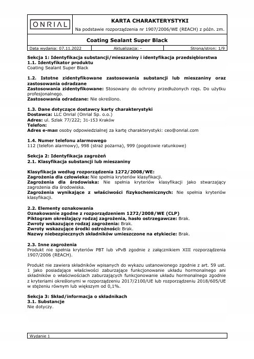 Название: ГЕРМЕТИК ДЛЯ ПОКРЫТИЯ ONRIAL SUPER BLACK