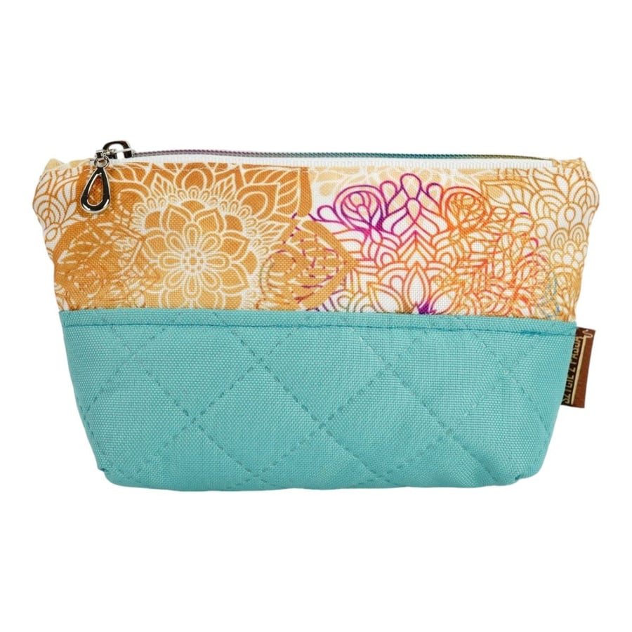 Цветовая гамма этой косметички визуально привлекательна: яркие оранжевые, розовые и желтые оттенки рисунка мандалы красиво контрастируют с бирюзовой нижней частью.