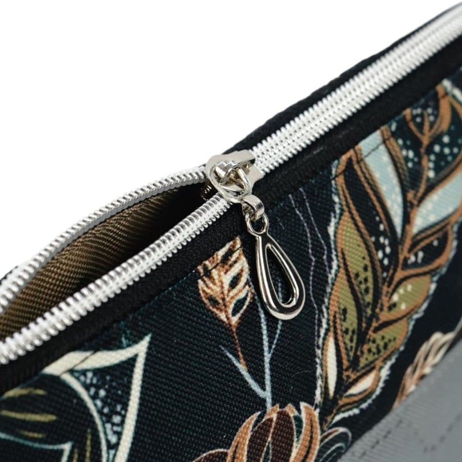 Эта косметичка ручной работы имеет внутренний карман для лучшей организации вещей. Сочетание темного цветочного узора с приглушенным серым цветом создает изысканный, стильный образ, который понравится широкому кругу пользователей.