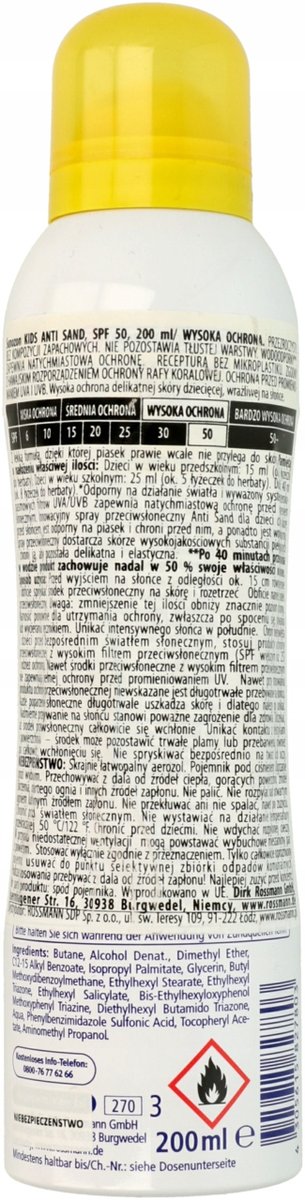 *Светостойкая и сбалансированная система широкополосных UVA/UVB-фильтров обеспечивает немедленную защиту от солнечных ожогов. Инновационный солнцезащитный спрей Anti Sand для детей защищает кожу от солнца, устойчив к песку и защищает от него, а также обладает водоотталкивающими свойствами. Солнцезащитный спрей обеспечивает кожу высококачественными ухаживающими веществами и защищает ее, делая мягкой и эластичной.