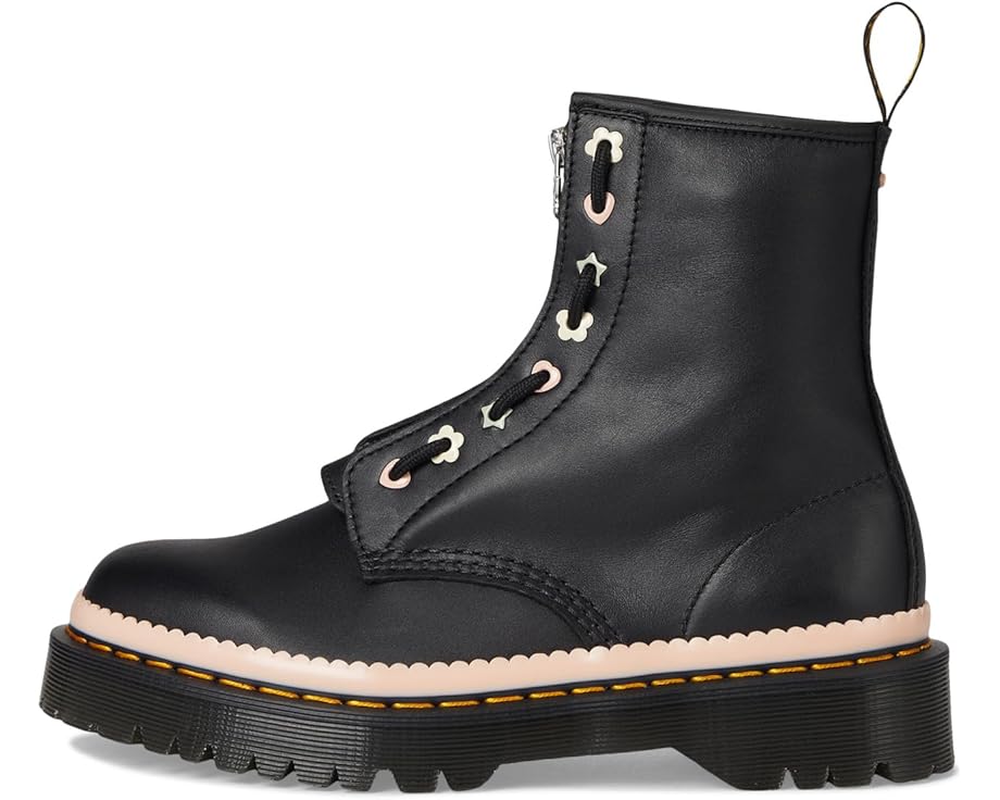 Цветочные детали и яркие цвета. Ботинки Dr. Martens 1460 Bex Front Zip — это классический силуэт с 8 люверсами и увеличенной высотой, а эта версия Pascal построена на немного более узкой колодке для более облегающей посадки. Ботинки изготовлены из мягкой кожи Nappa Luxe и имеют соответствующую съемную переднюю молнию с язычком-бабочкой. Простые люверсы заменены на цветочные и сердечные формы и пастельные оттенки. Ботинок имеет пудрово-розовый фестончатый рант над желтой строчкой по краю, а Подошва имеет рифленый край и преувеличенную насечку.