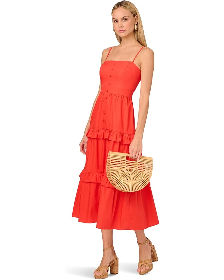 Мягкое и солнечное, это однотонное платье-миди Adrianna Papell Solid Tiered Midi Dress просто необходимо для теплых дней. Многослойная юбка-миди создает силуэт А-силуэта, подчеркнутый изящной оборчатой отделкой для игривого нотка. Квадратный вырез с изящными бретельками-спагетти добавляет изящности, а пуговицы спереди подчеркивают винтажный образ платья. Застежка-молния сзади обеспечивает бесшовную посадку, делая это платье-миди идеальным для всего: от бранча до пляжных прогулок
