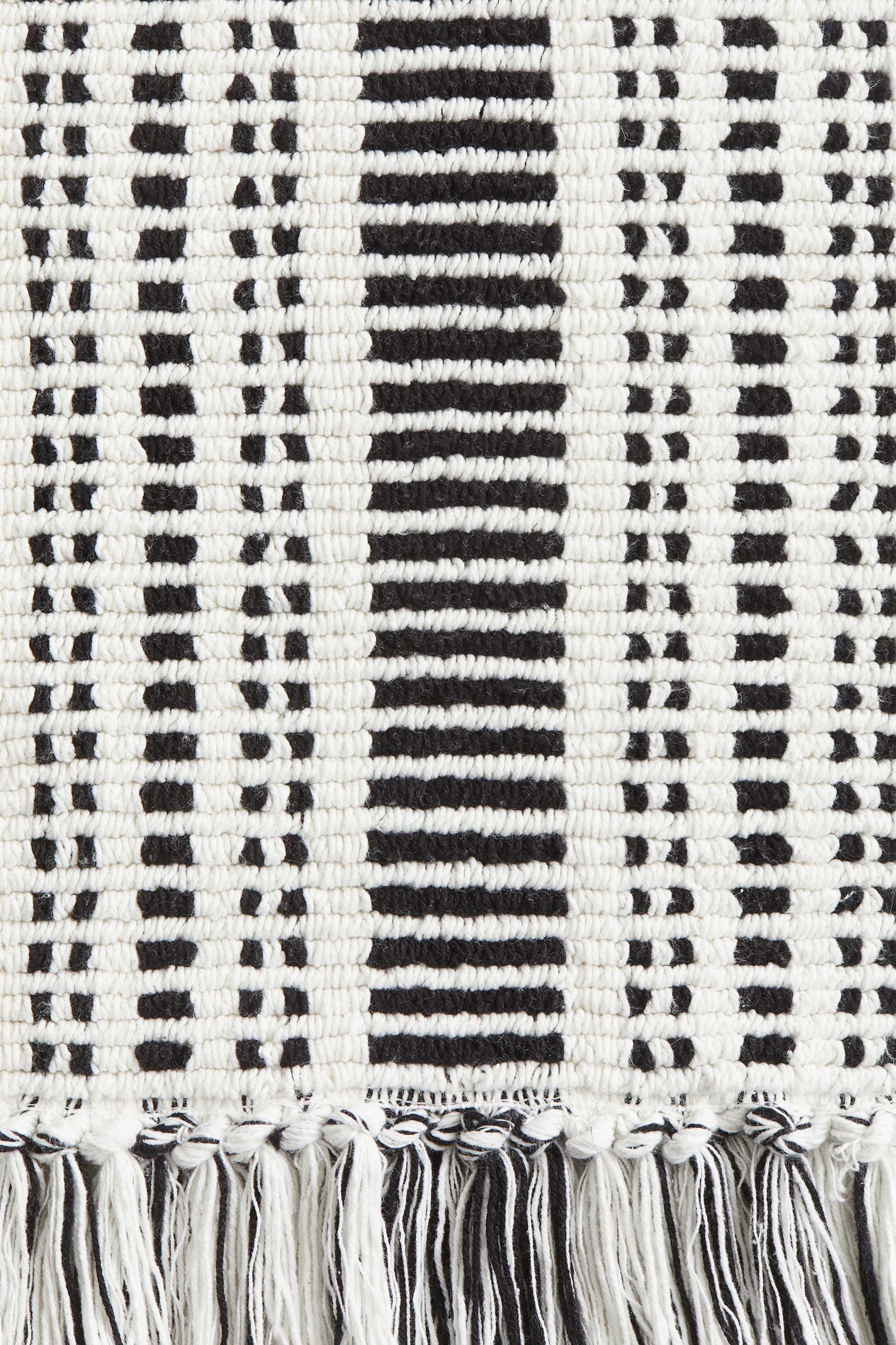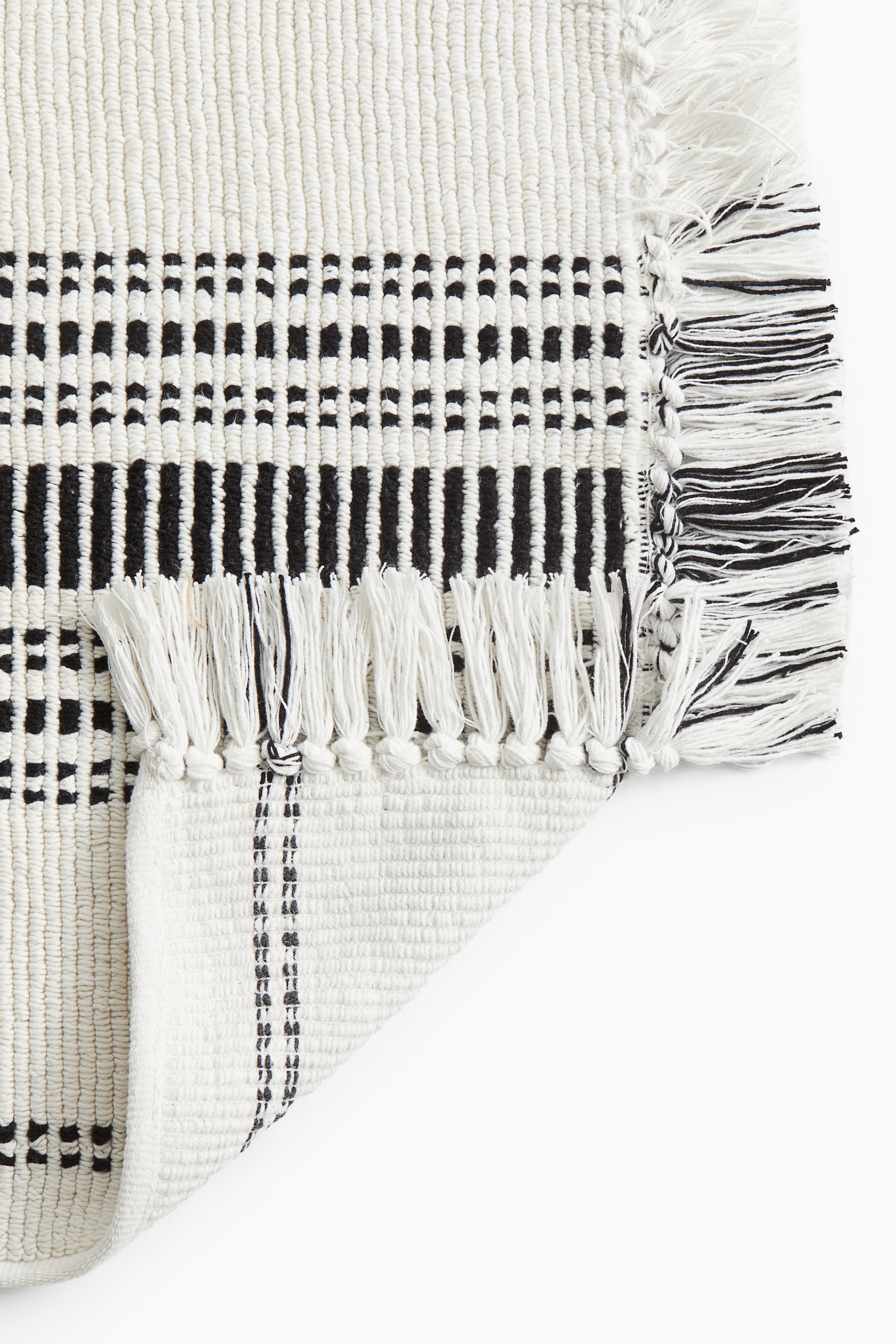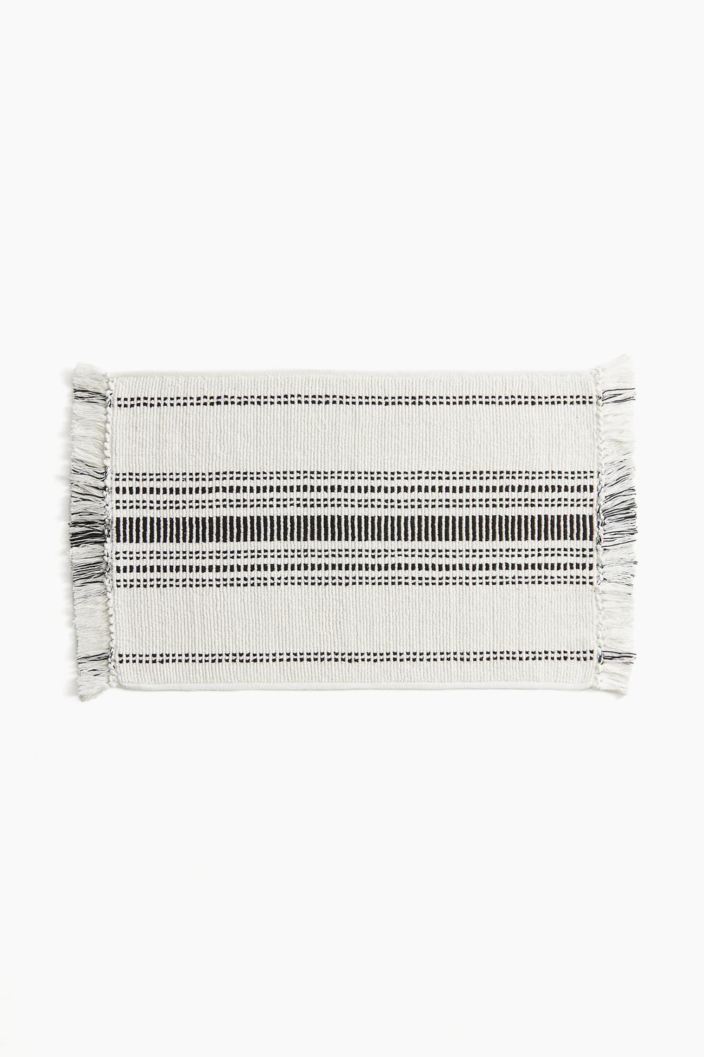 Коврик для ванной из хлопчатобумажной ткани с полосатым рисунком и бахромой на коротких сторонах. Защита от скольжения на тыльной стороне.