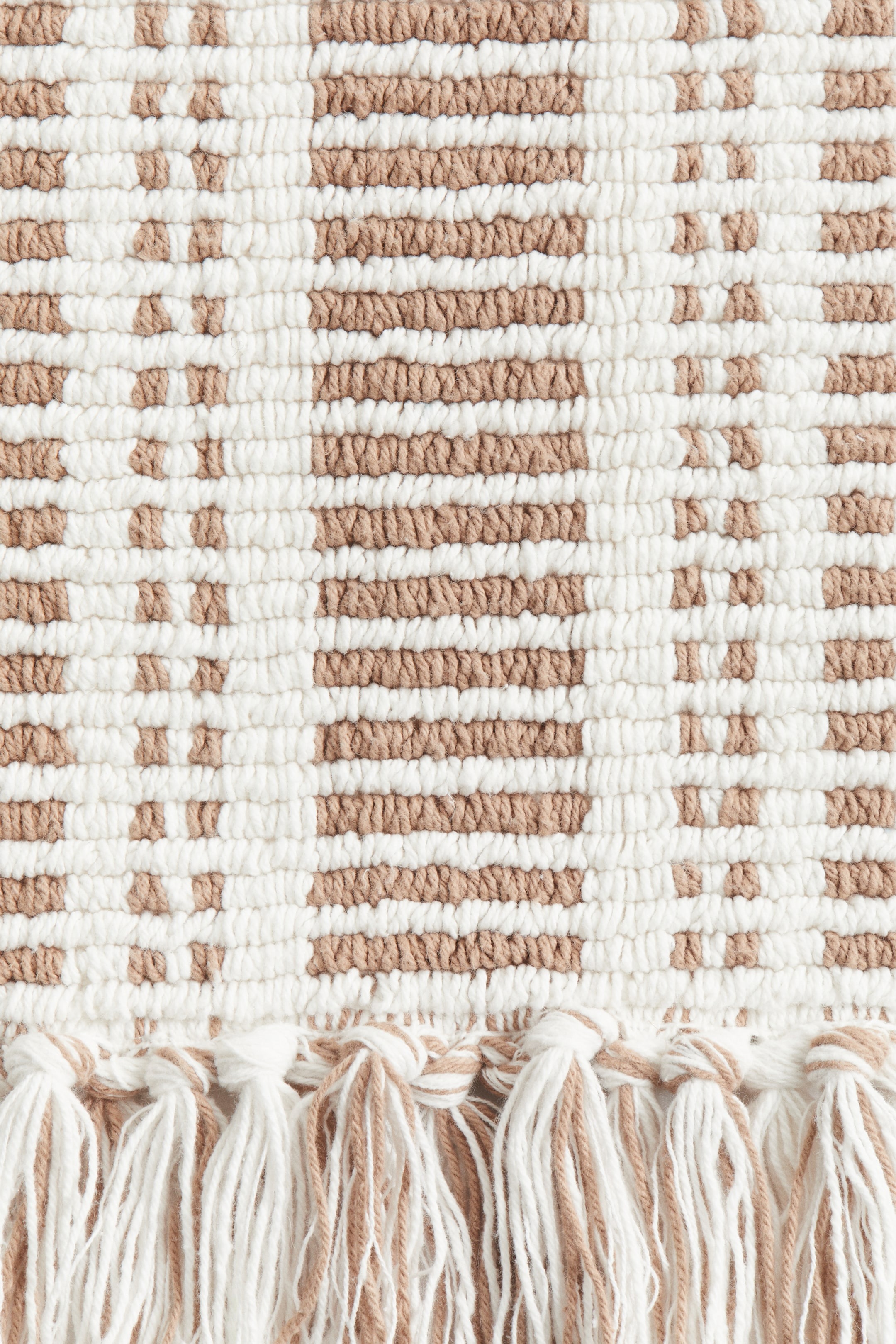 Коврик для ванной из хлопчатобумажной ткани с полосатым рисунком и бахромой на коротких сторонах. Защита от скольжения на тыльной стороне.