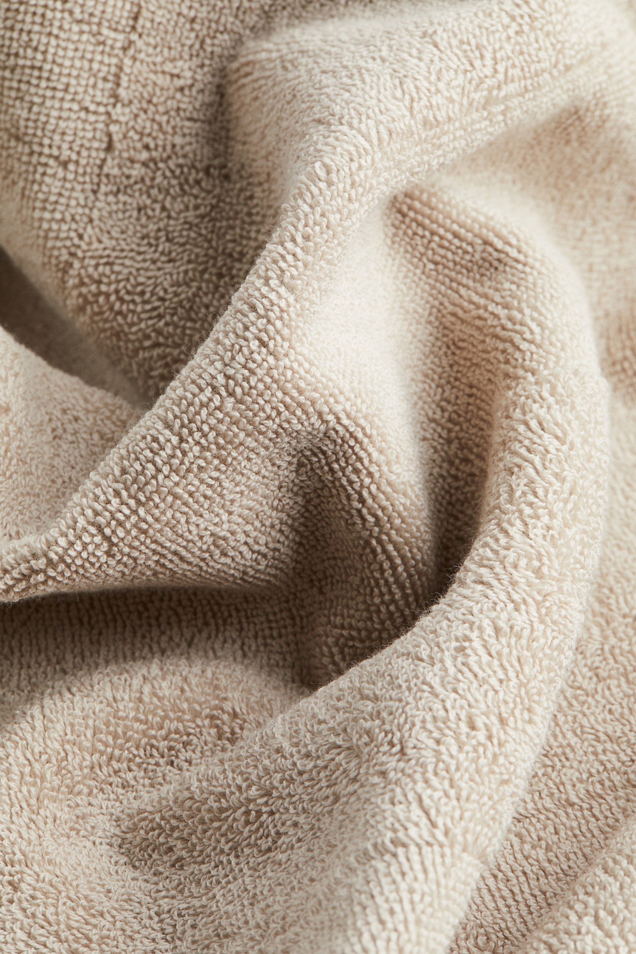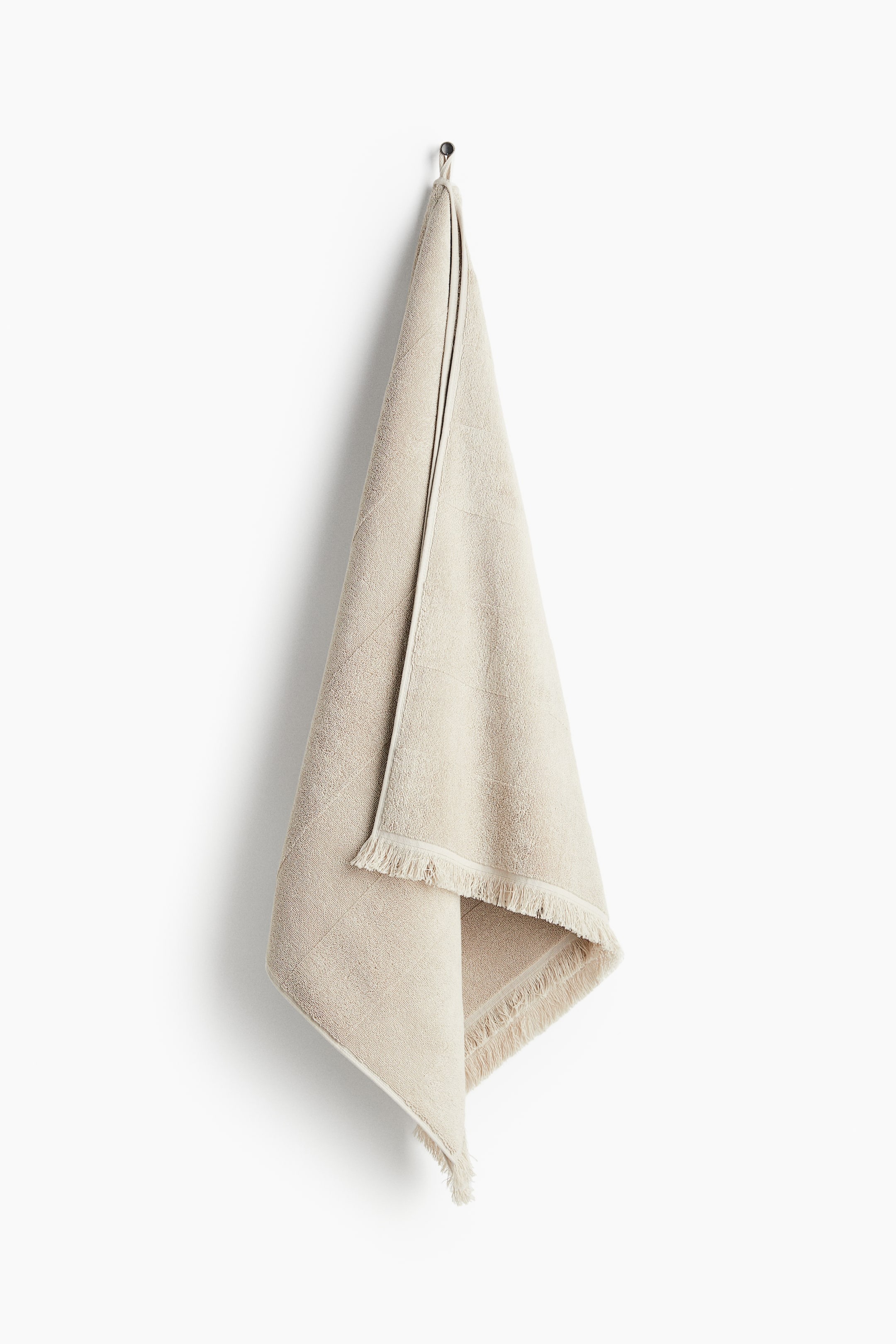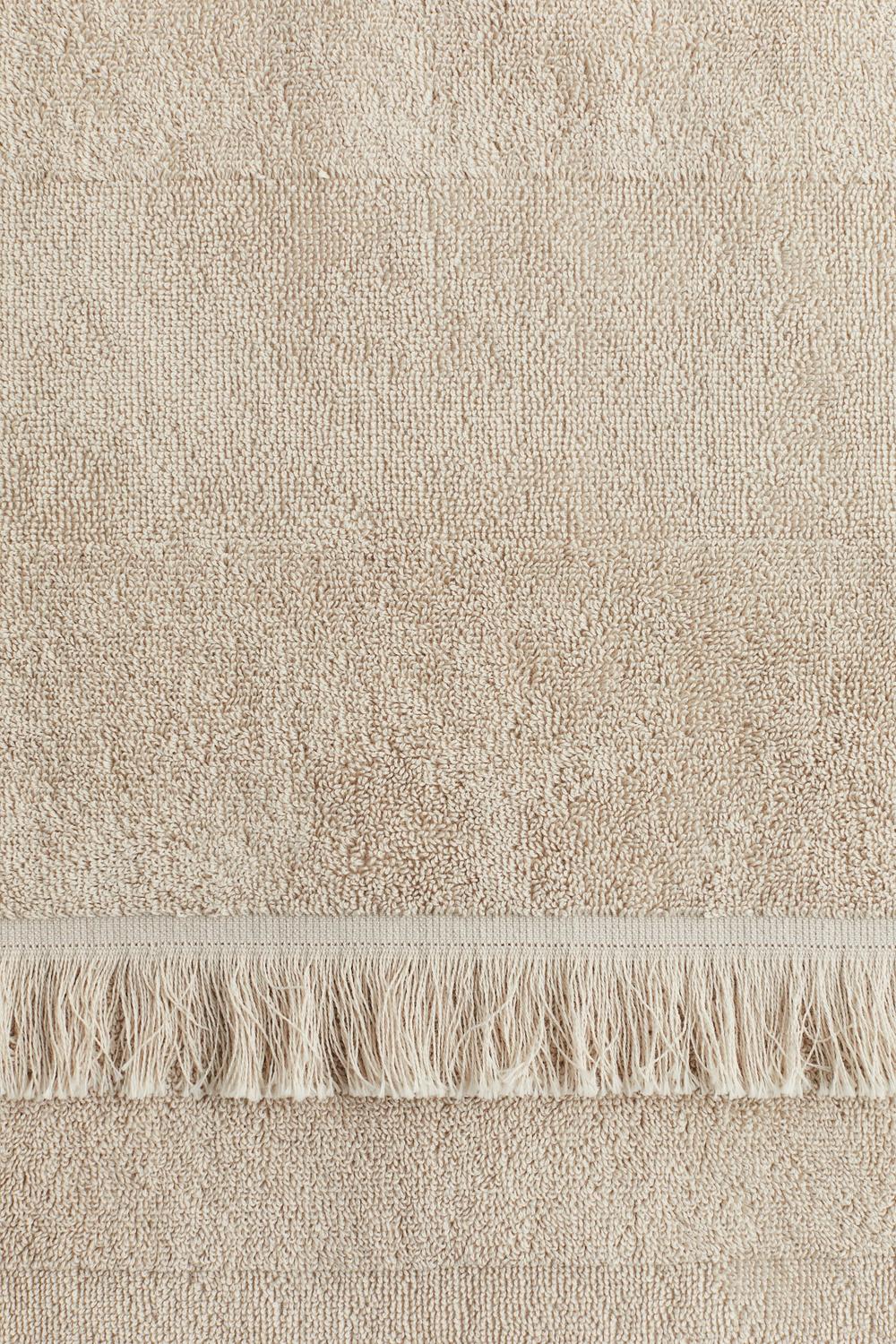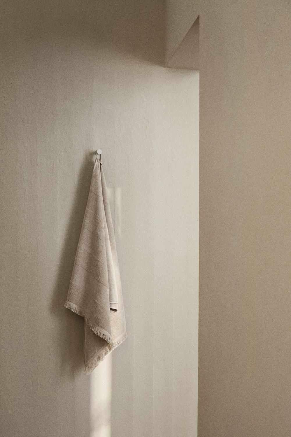 Махровое полотенце для рук из хлопка с ворсом, срезанным на разной высоте, чтобы создать тонкий узор в полоску. С бахромой на коротких сторонах и вешалкой на длинной стороне.