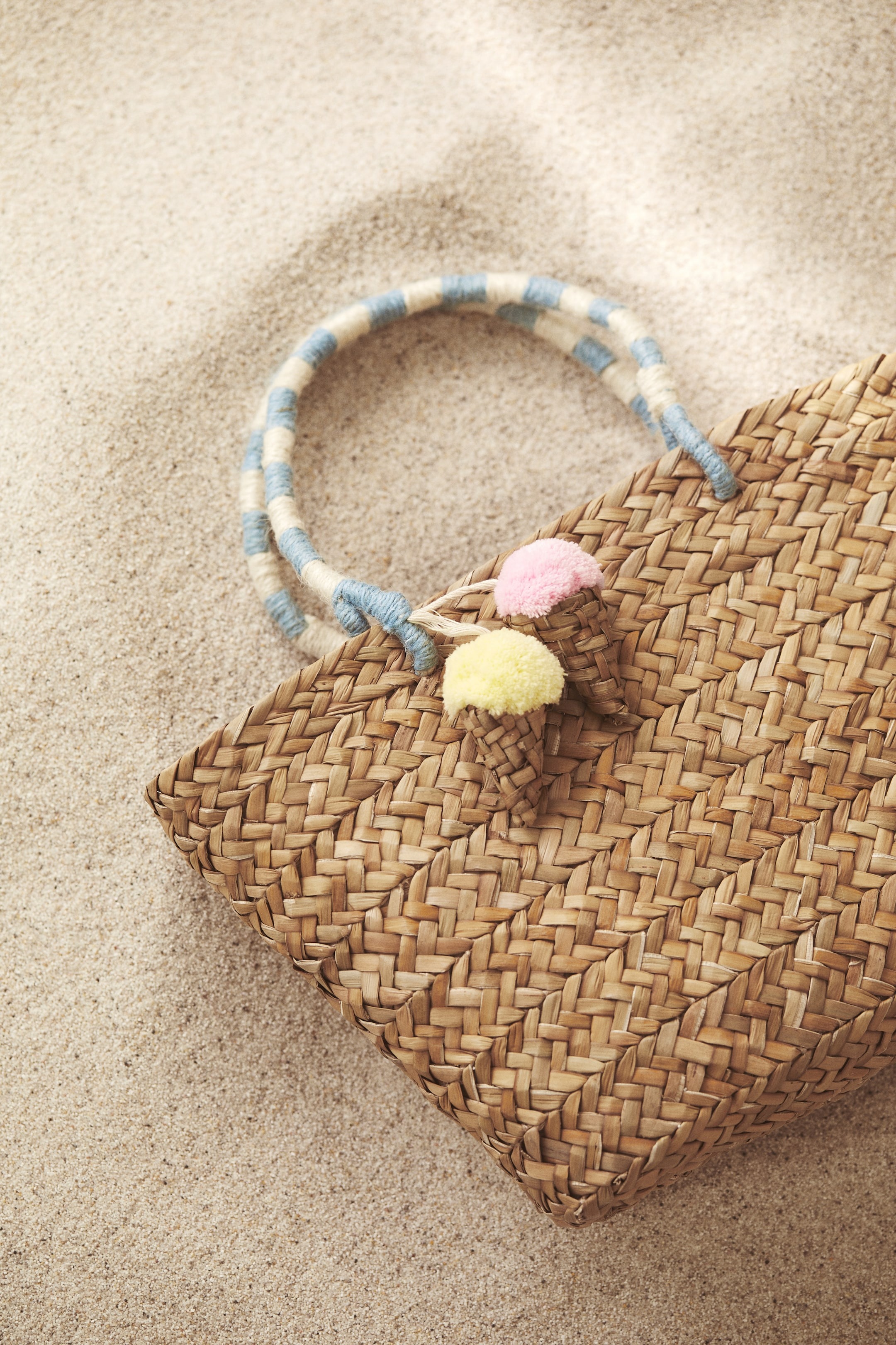 Сумка-шоппер из плетеной соломки с двумя джутовыми ручками и милыми брелоками в виде рожков для мороженого. Без подкладки. Ширина 10 см. Высота 24 см. Длина 38 см.
