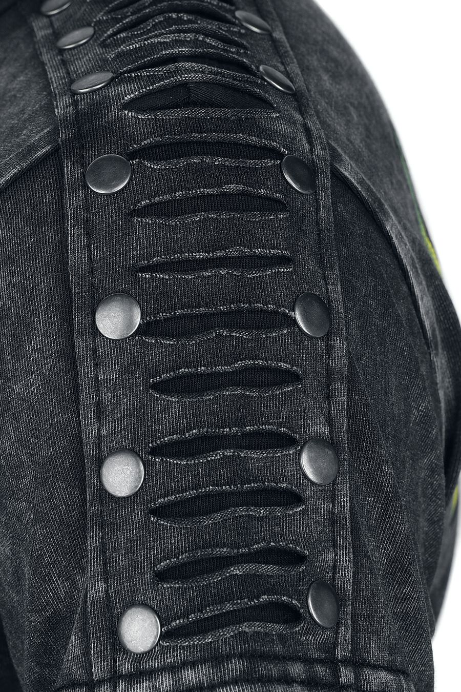 Детали: потертый вид, винтаж, вырезы, заклепки, принт спереди, принт сзади, необработанные края по подолу