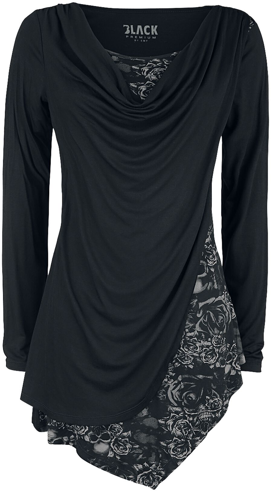 Черная рубашка с длинными рукавами, водопадным вырезом и принтом