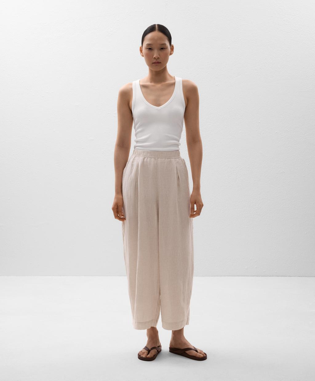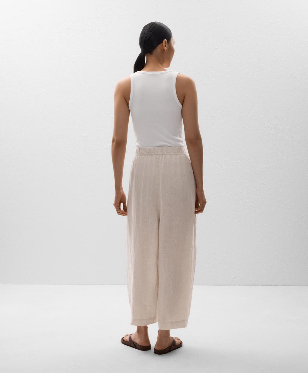 Укороченные брюки-баллоны с передними карманами и регулируемой эластичной талией. Ткань: 100% лен.