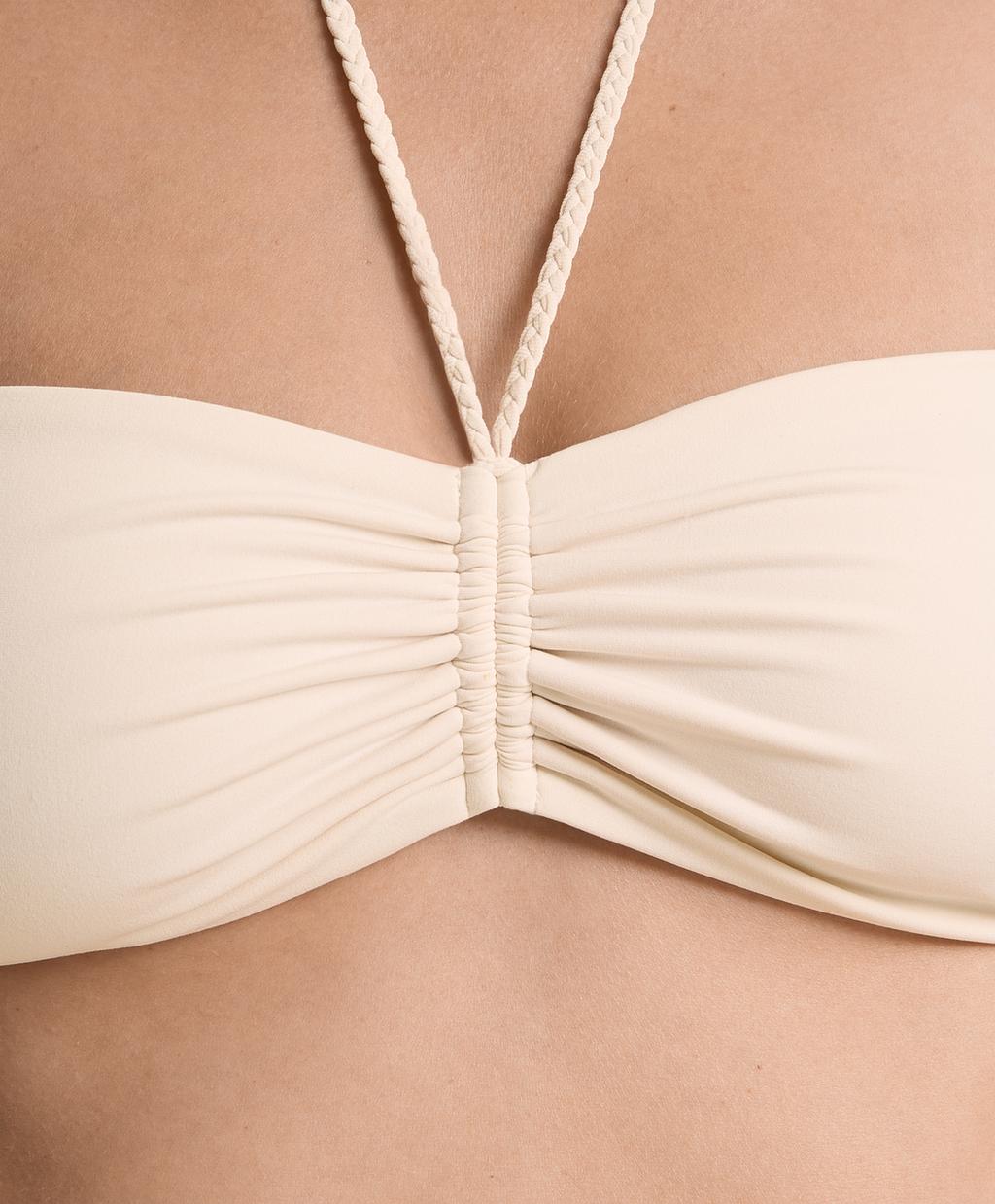 Топ-бикини-бандо без косточек со съемными чашечками. Присборенная деталь спереди и плетеный ремешок для завязывания на шее.