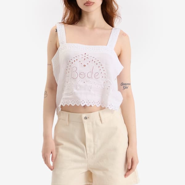 Выделяясь из толпы благодаря использованию редких, винтажных тканей, эта майка Bode изготовлена из льна. Безрукавка, эта майка характеризуется квадратным вырезом и фестончатыми краями, в то время как техника бродери англез добавляет отличительный вид.