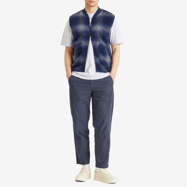Брюки Folk drawcord Assembly в темно-синей полоске сочетают в себе непринужденный комфорт и изысканную отделку. Свободный зауженный крой с укороченными штанинами, фактурный полосатый хлопок, эластичный пояс с завязкой, плиссированная передняя часть и итальянские пуговицы корозо. Тройная строчка в тон и детали карманов дополняют эту возвышенную повседневную основу.