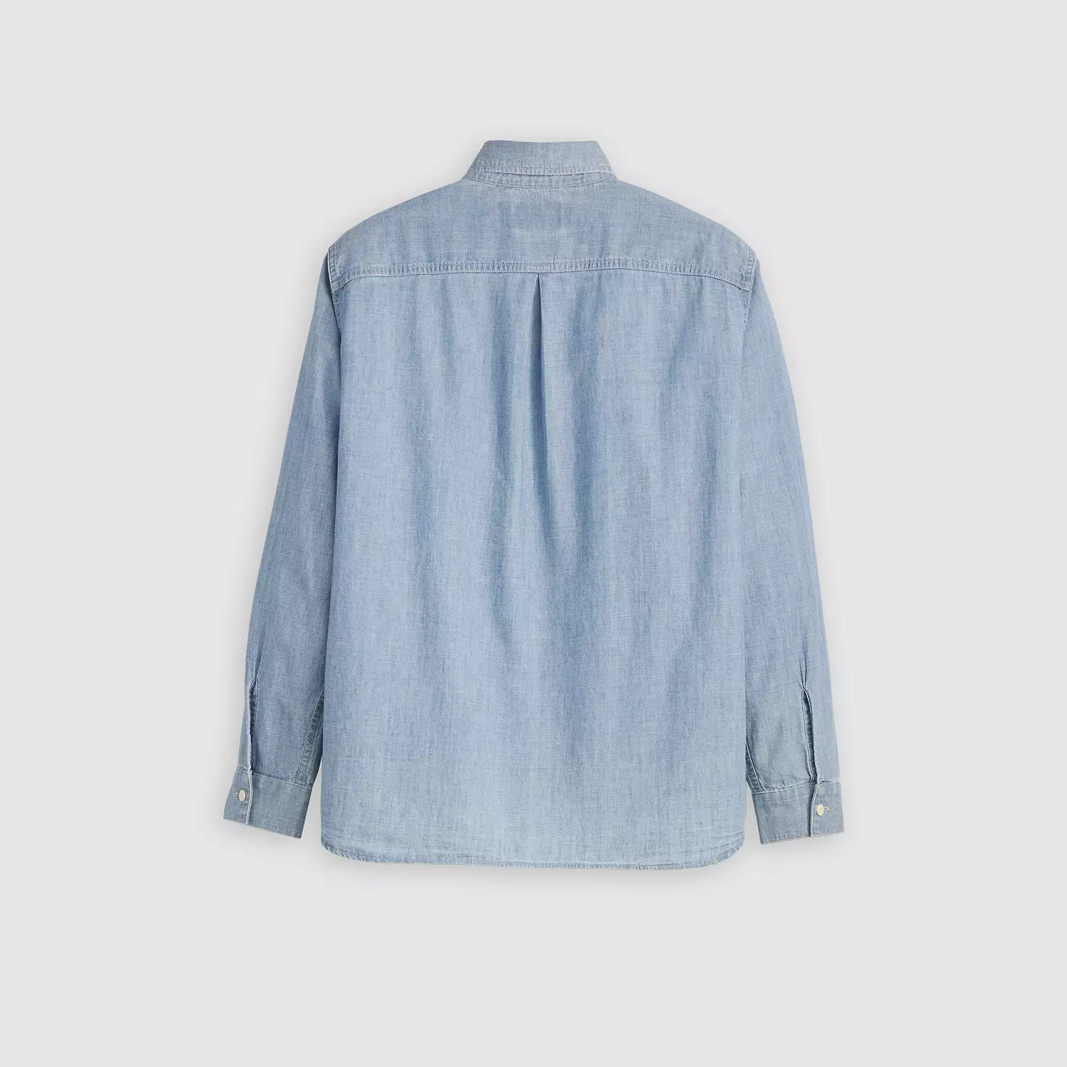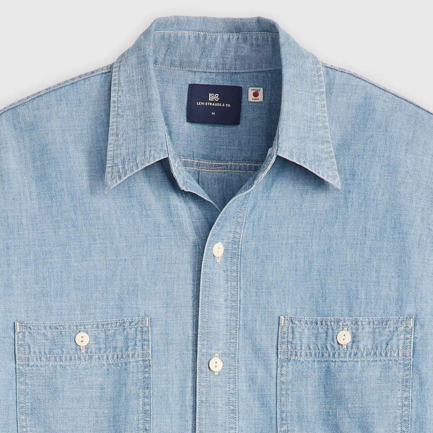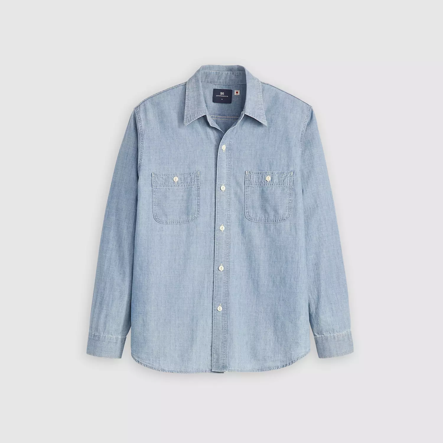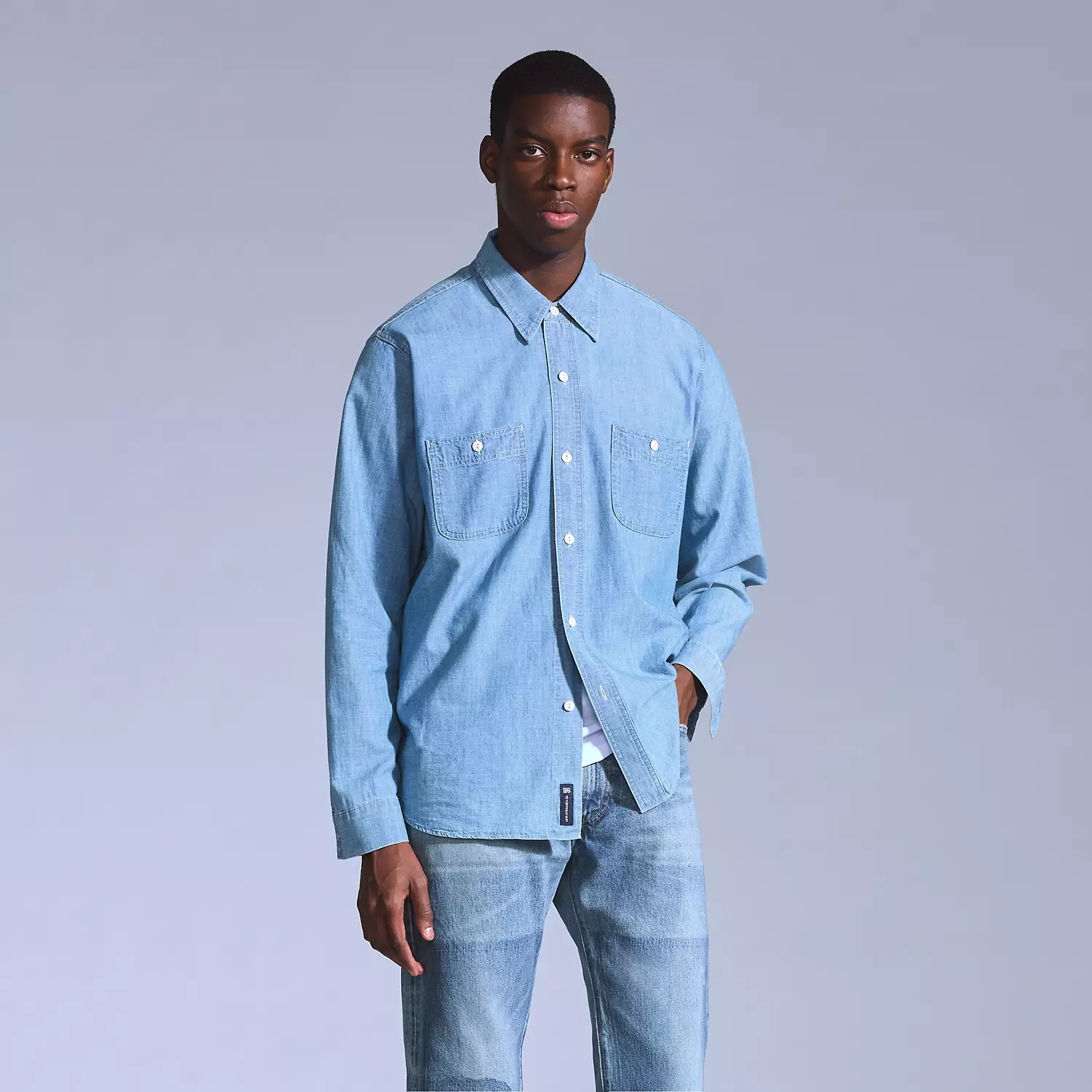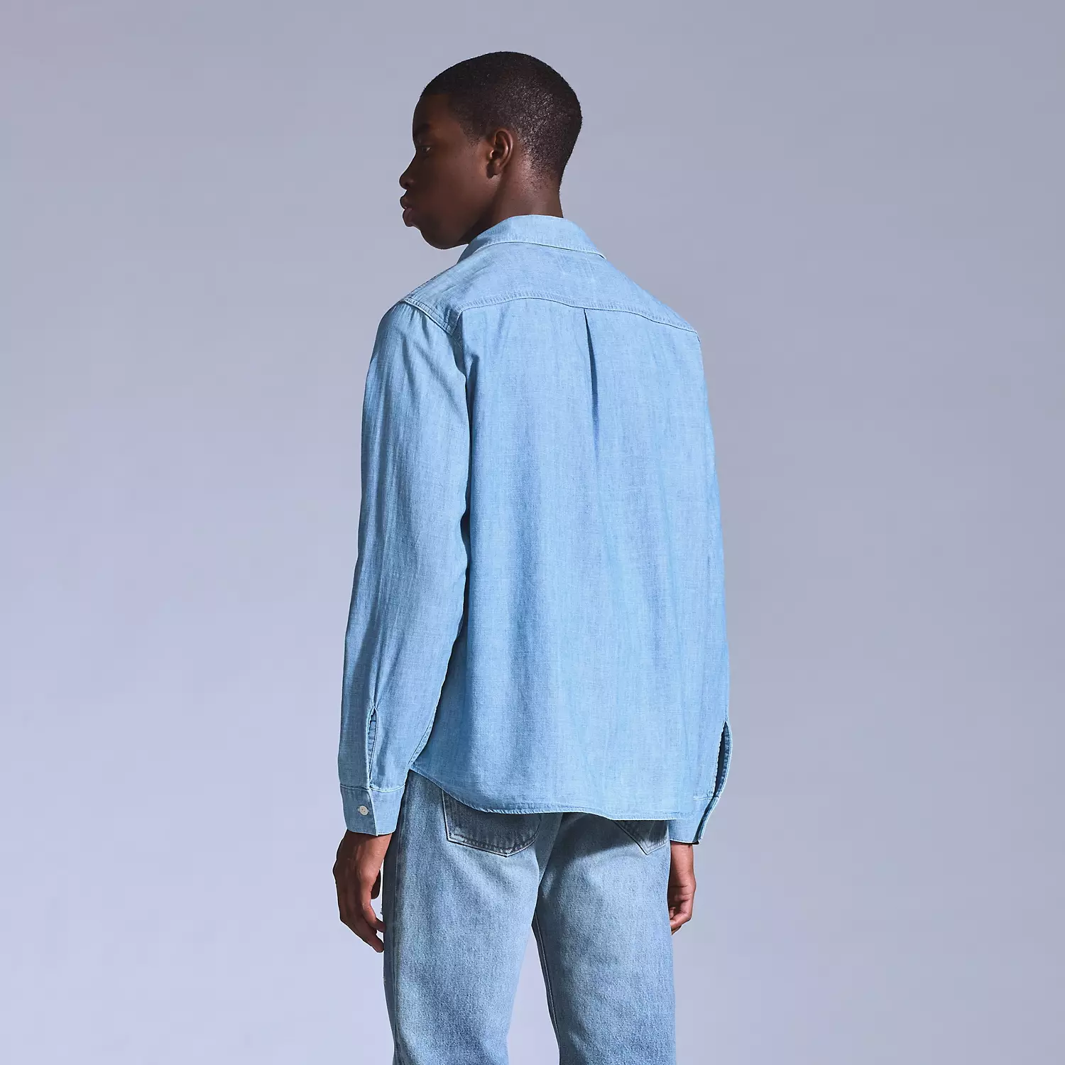 Наша рабочая рубашка столь же изысканна, сколь и практична благодаря классической застежке на пуговицы, удобному стандартному крою и ткани из селведж денима.