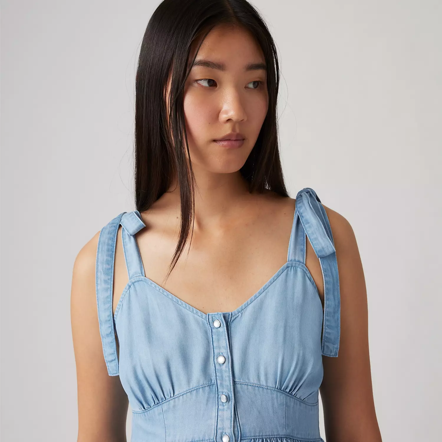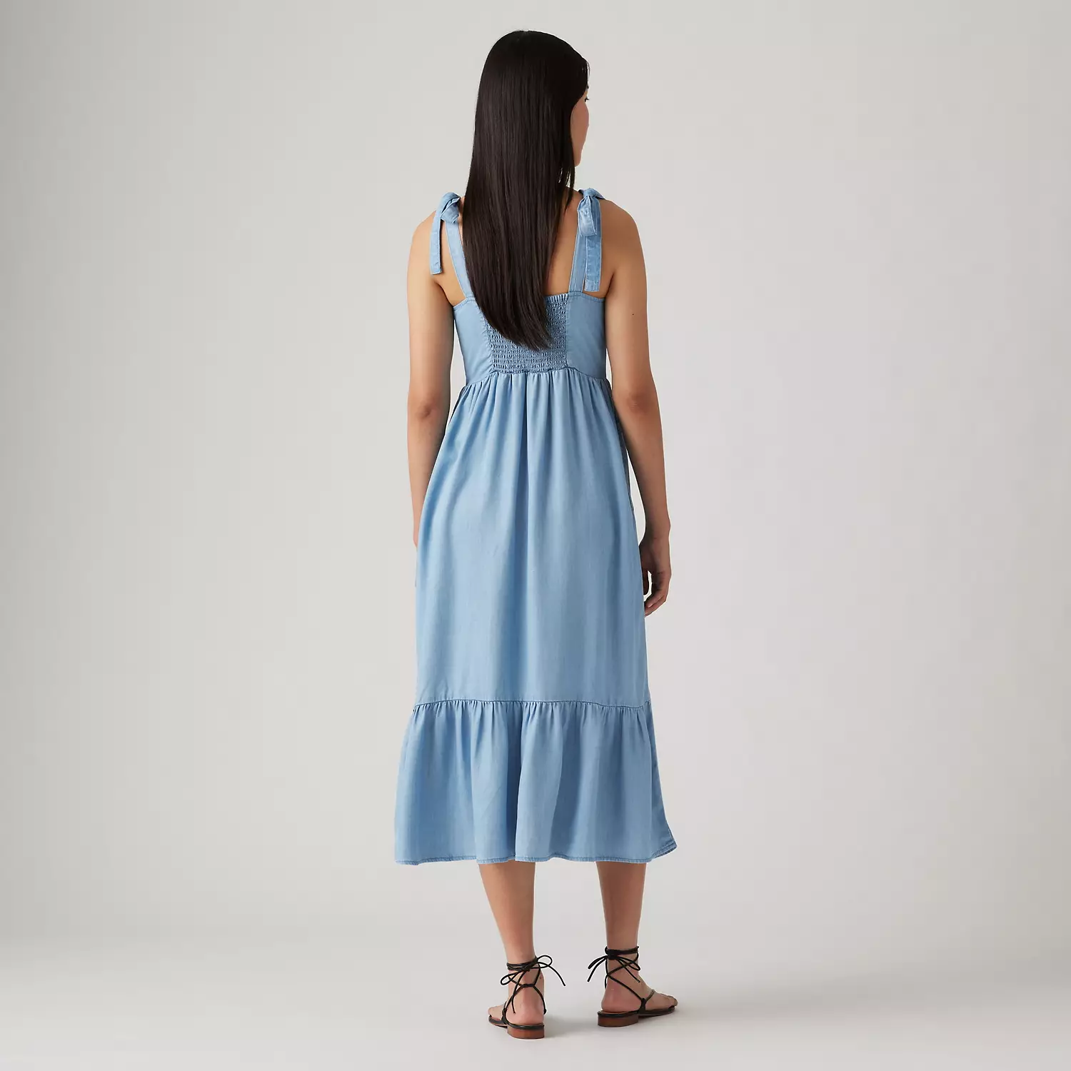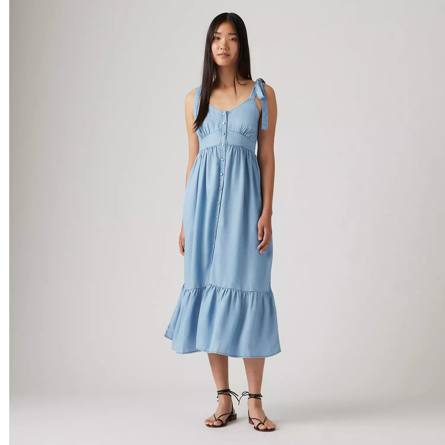 Наше платье-макси Кэтрин делает процесс одевания легким. Оно имеет регулируемые завязки на плечах, застежку на пуговицах спереди иtiered юбку.