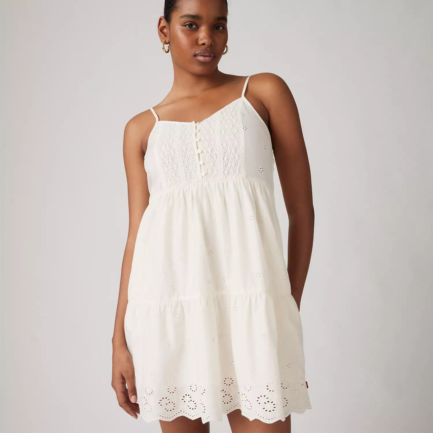 Идеальный партнер для теплых дней. Наше мини-платье Cora обладает регулировочными бретельками, силуэтом бэби-долл и красивыми отверстиями с узорами.