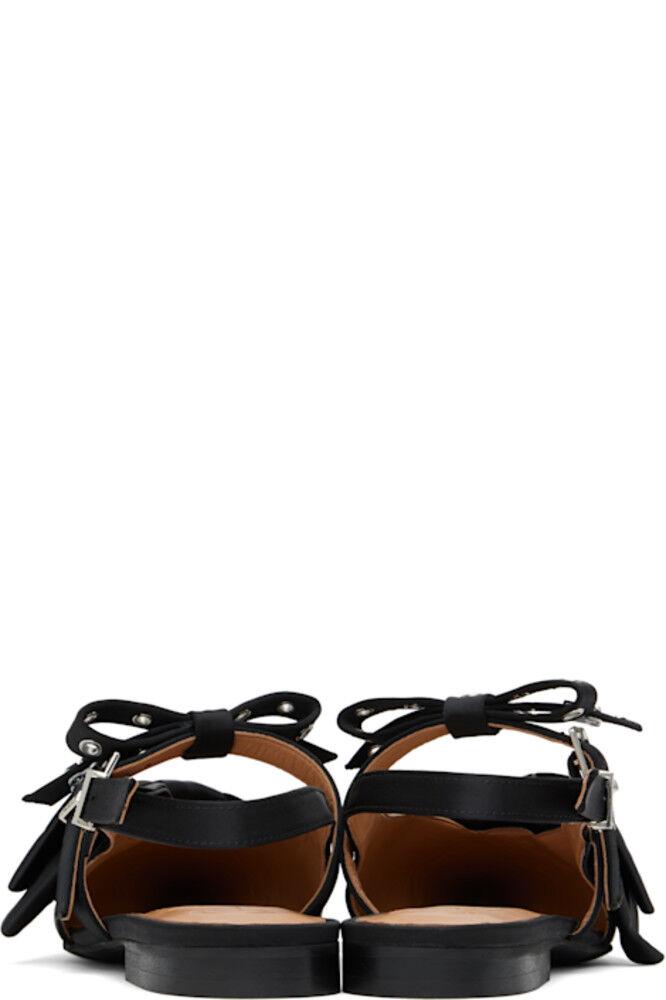 Атласные балетки черного цвета. · Аппликация в виде банта на остром носке · Бант с люверсами и логотипом на союзке · Ремешок с пряжкой на союзке · Ремешок с пряжкой на пятке · Тисненый логотип на мягкой стельке · Подкладка из полированной искусственной кожи · Наборный каблук из искусственной кожи с резиновым вкраплением · Резиновая подошва · Серебристая фурнитура с гравировкой логотипа