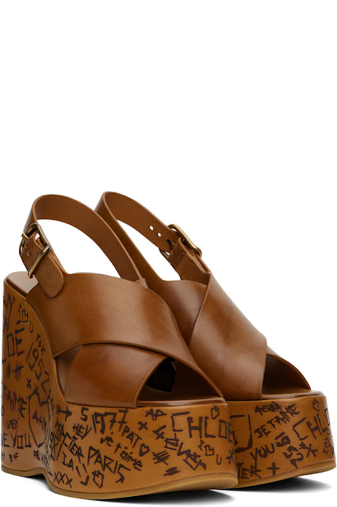 Босоножки на каблуке из шлифованной кожи с сертификатом LWG коричневого цвета. · Открытый носок · Перекрещивающиеся ремешки на союзке · Ремешок с пряжкой на пятке · Стелька из шлифованной телячьей кожи с тиснением логотипа · Текст выгравирован на закрытой платформе и танкетке · Подошва из крепированной резины · Фурнитура цвета состаренной латуни с гравировкой логотипа · Платформа: H2.25" · Каблук: H5"