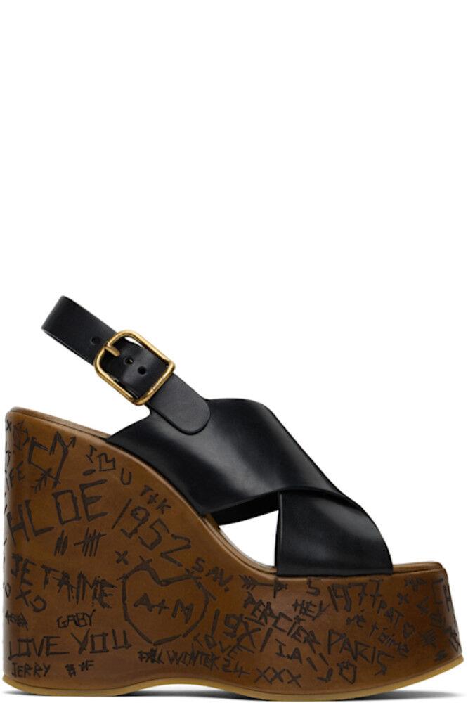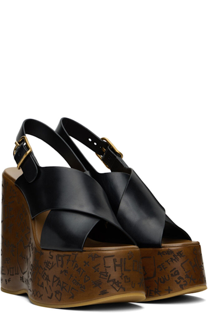 Босоножки на каблуке из шлифованной кожи с сертификатом LWG черного цвета. · Открытый носок · Перекрещивающиеся ремешки на союзке · Ремешок на пятке с пряжкой · Стелька из шлифованной телячьей кожи с тиснением логотипа · Текст выгравирован на закрытой платформе и танкетке · Подошва из крепированной резины · Фурнитура цвета состаренной латуни с гравировкой логотипа · Платформа: H2.25" · Каблук: H5"