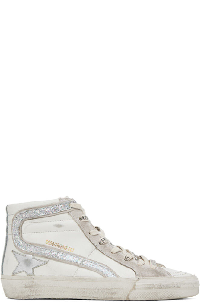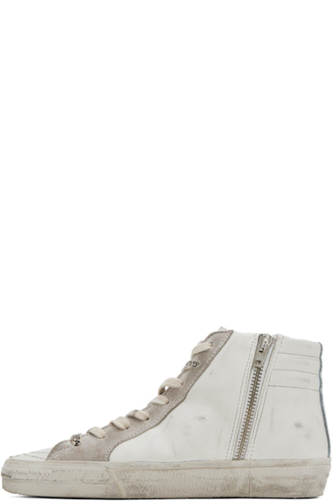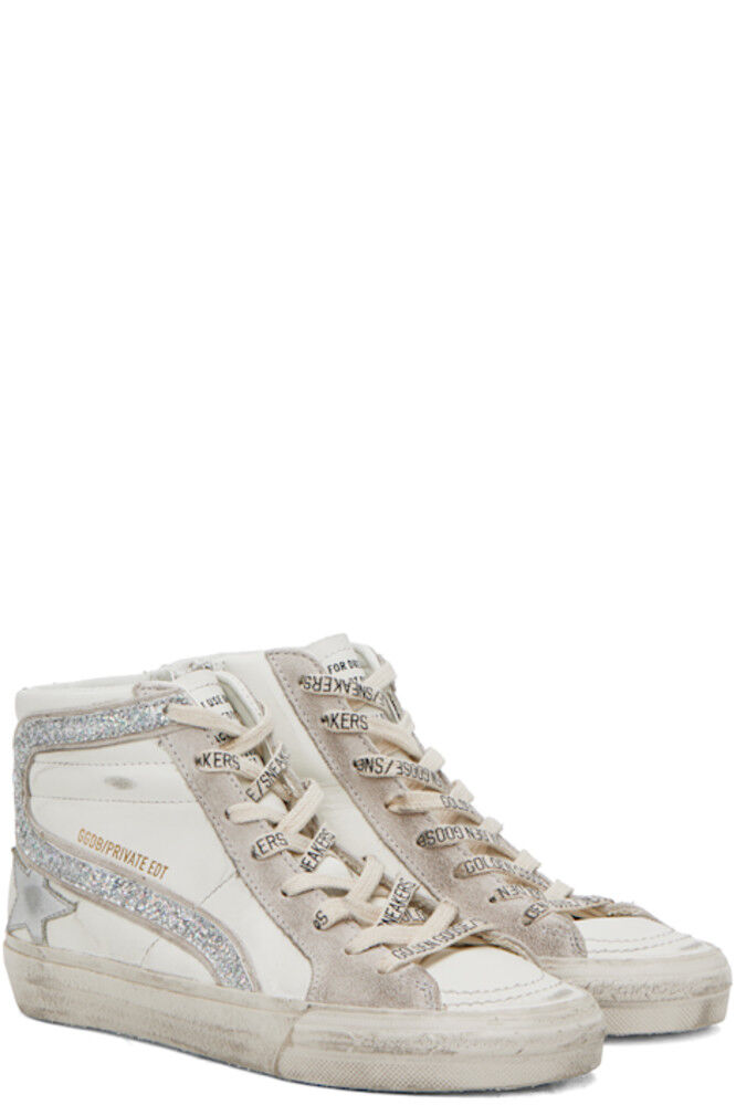 Высокие кроссовки из полированной кожи и замши, изготовленные вручную, белого цвета. · Пятна по всей поверхности · Застежка на шнуровке с логотипом · Текст, напечатанный на язычке · Мягкий воротник · Золотистый логотип на внешней стороне · Аппликация в виде звезды на внешней стороне · Блестящая аппликация на внешней стороне · Застежка-молния на внутренней стороне · Подкладка из зернистой кожи и махровой ткани · Резиновая подошва с протектором Доступно эксклюзивно в SSENSE.