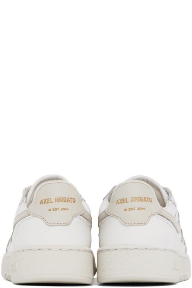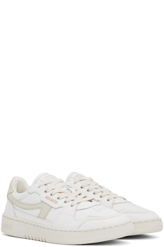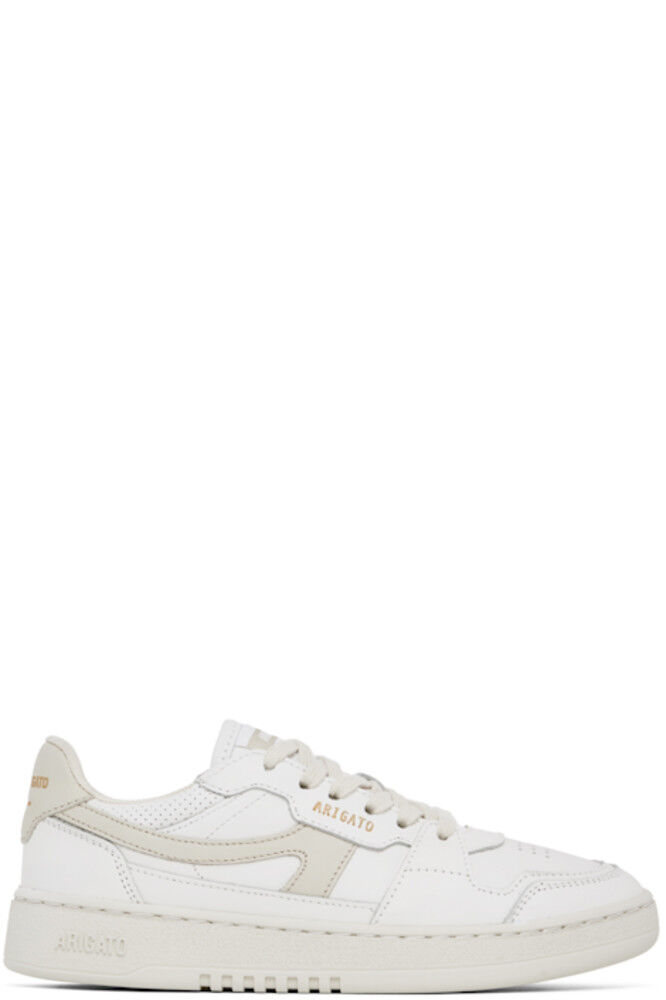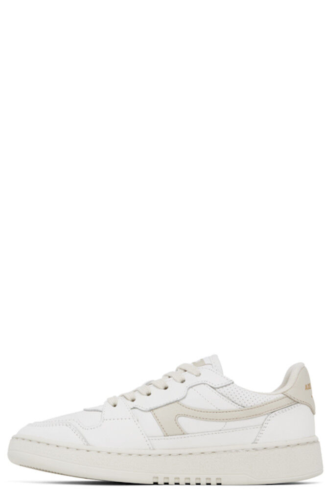 Изготовленные вручную низкие кроссовки из полированной кожи и парусины SEAQUAL® YARN белого и бежевого цветов. · Перфорированная отделка по всей поверхности · Шнуровка · Нашивка с логотипом на мягком язычке · Мягкий воротник · Аппликация с логотипом по бокам · Печать с логотипом на внешней стороне и на пятке · Подкладка из переработанной сетки и искусственной замши · Тисненый логотип на текстурированной резиновой подошве · Резиновая подошва с протектором