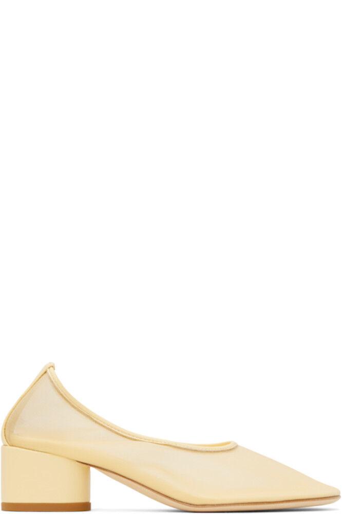 Каблуки из полупрозрачной сетки, выполненные вручную, желтого цвета.