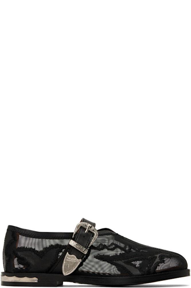 Лоферы в стиле Мэри Джейн из прозрачной сетки и полированной кожи черного цвета.