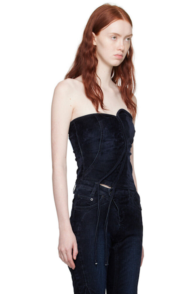 Майка-корсет из эластичного флокированного денима ручной работы. Кант по всему изделию. · Асимметричная конструкция · Вырез сердечком · Скрытая шлица на молнии и удлиненная отделка по подолу · Застежка-молния и прорезиненная нашивка с логотипом сзади Каждое изделие уникально. Обратите внимание, что расцветка и отделка могут отличаться.