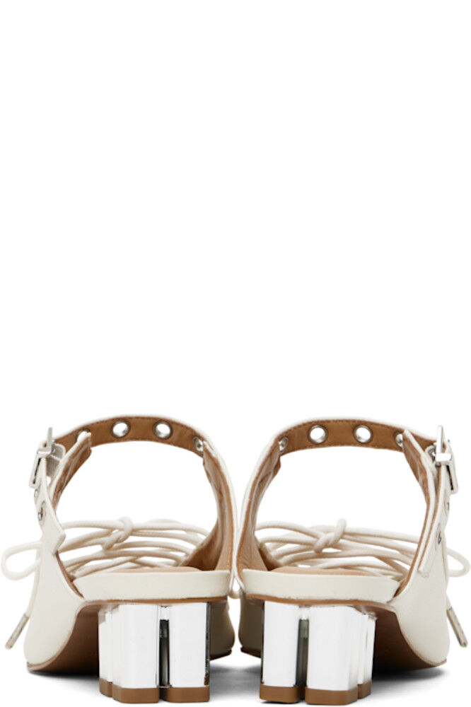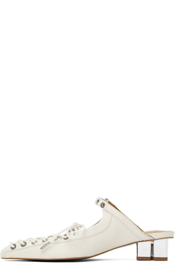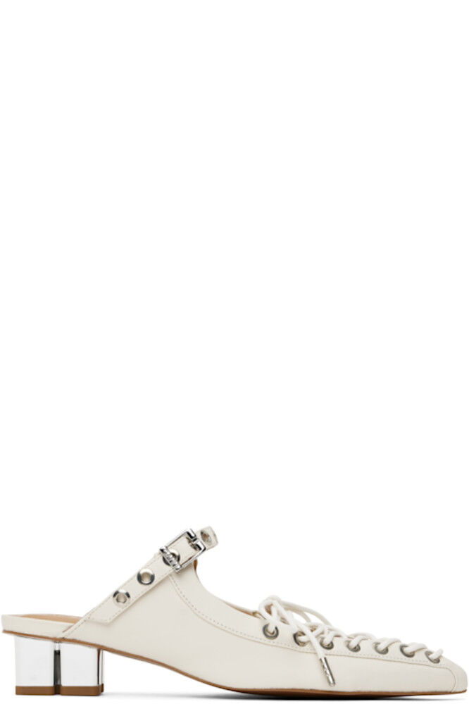Мюли из зернистой искусственной кожи Pélinova® в кремовом цвете. · Острый носок · Шнуровка · Ремешок с пряжкой на мыске · Тисненый логотип на мягкой стельке из искусственной кожи · Графический логотип на каблуке с резиновым напылением · Подошва из искусственной кожи с резиновым напылением · Серебристая фурнитура с гравировкой логотипа · Каблук: H1.5"