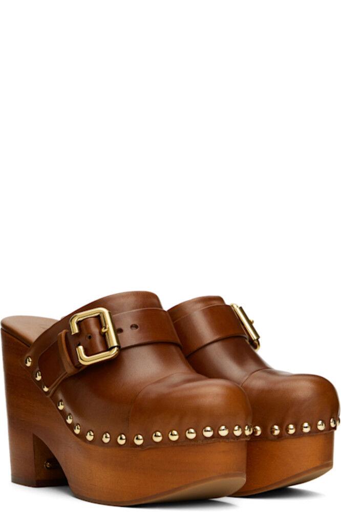Мюли из полированной кожи коричневого цвета с сертификатом LWG. · Ремешок с пряжкой на мыске. · Заклепки по ранту. · Мягкая стелька из полированной телячьей кожи с тиснением логотипа. · Каблук из деревянного бруска и промежуточная подошва-платформа. · Пластинка с логотипом на пятке. · Текстурированная резиновая подошва. · Фурнитура золотистого тона. · Платформа: H2" · Каблук: H4.5"
