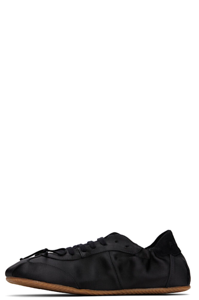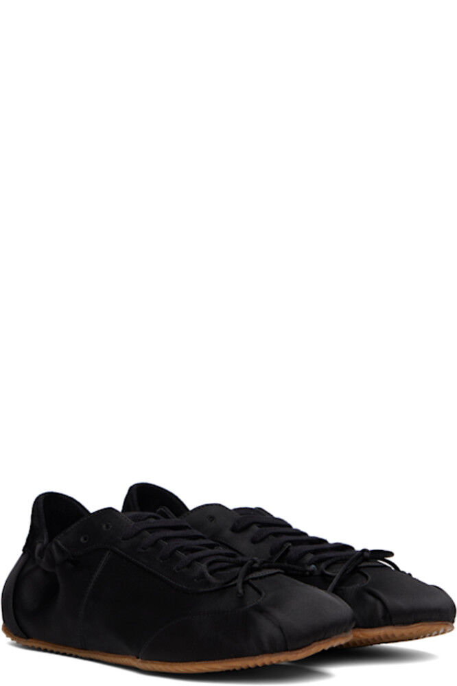 Низкие атласные кроссовки черного цвета.