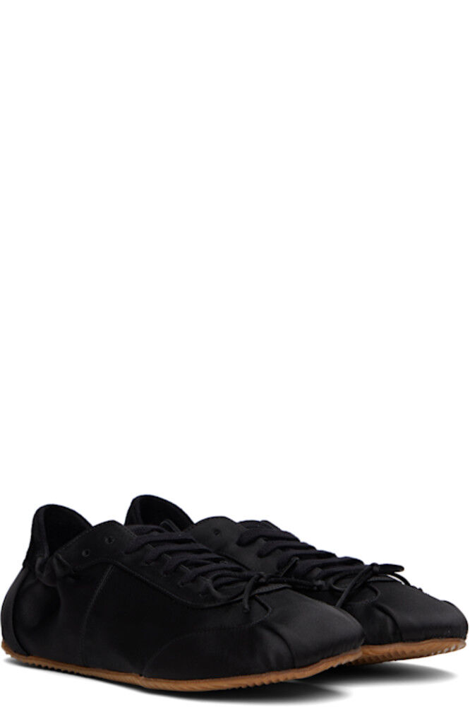 Низкие атласные кроссовки черного цвета.