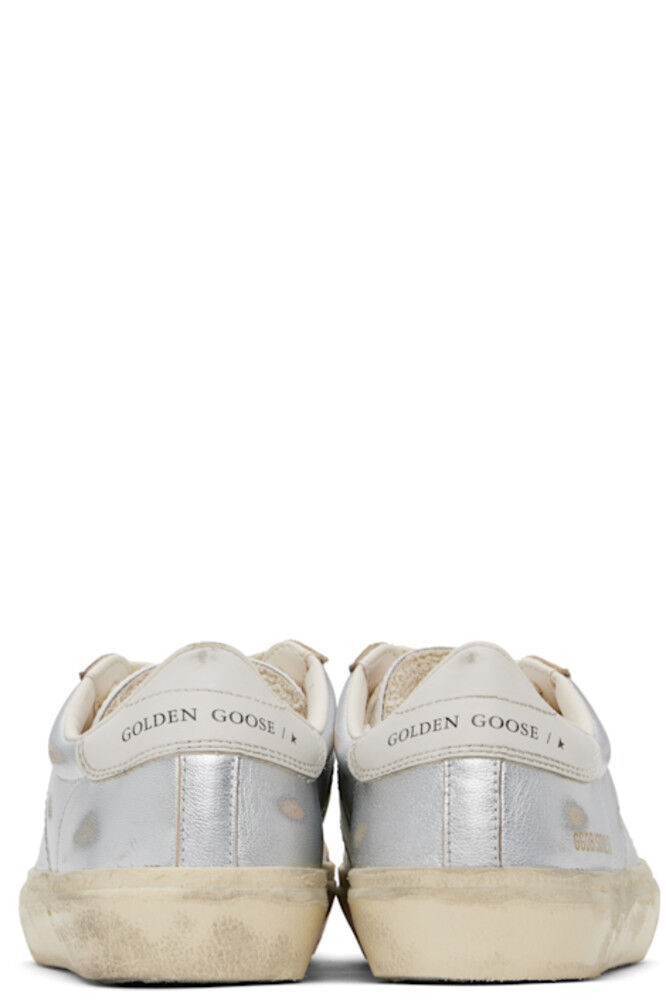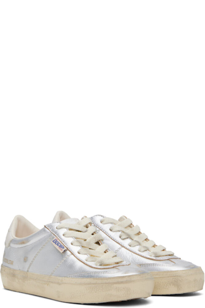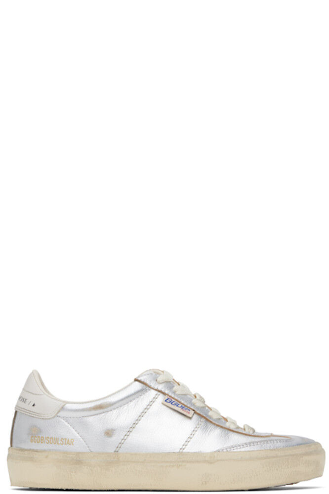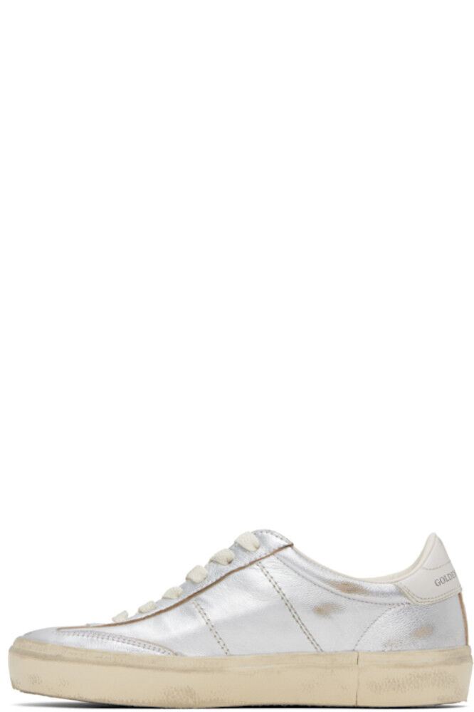 Низкие кроссовки из зернистой овчины ручной работы в серебристо-металлическом тоне. · Пятна и легкие потертости по всей поверхности · Шнуровка · Логотип, тисненый на мягком язычке · Мягкий воротник · Логотип и штамп на внешней стороне · Логотип, напечатанный на пятке из полированной кожи · Подкладка из полированной искусственной кожи и махровой ткани · Резиновая подошва с протектором