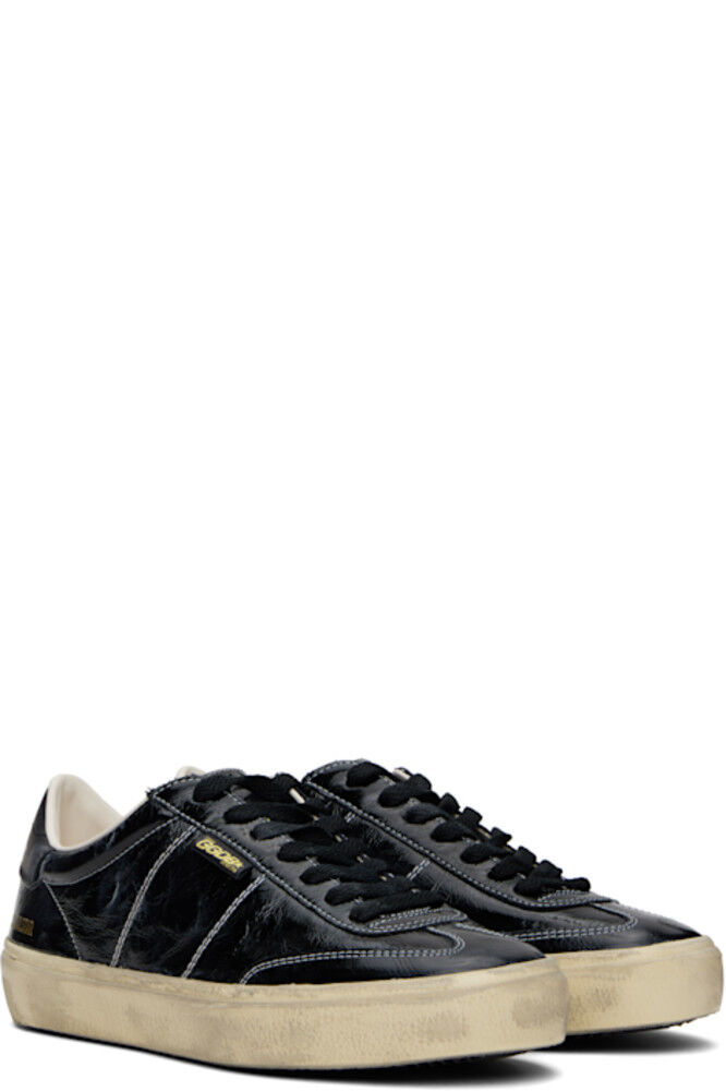 Низкие кроссовки из лакированной кожи ручной работы черного цвета. · Пятна и легкие потертости по всей поверхности · Шнуровка · Тисненый логотип на мягком язычке · Мягкий воротник · Флажок с логотипом и штамп на внешней стороне · Логотип, напечатанный на пятке из полированной кожи · Подкладка из полированной искусственной кожи и махровой ткани · Резиновая подошва с протектором · Контрастная строчка белого цвета