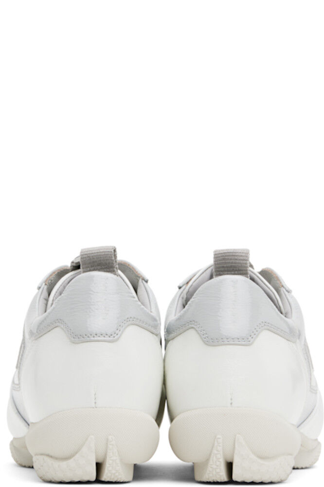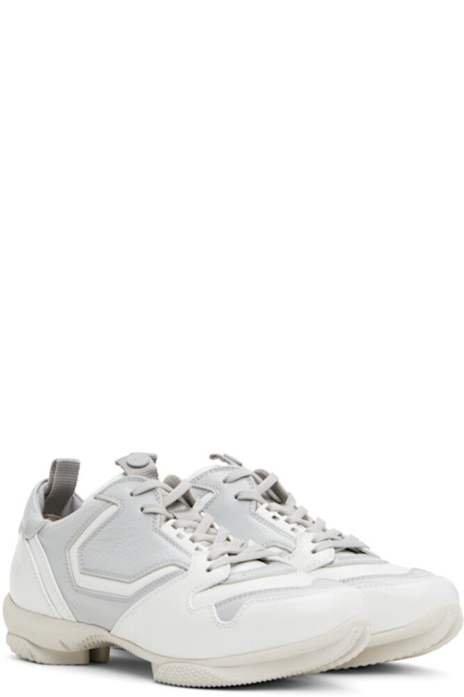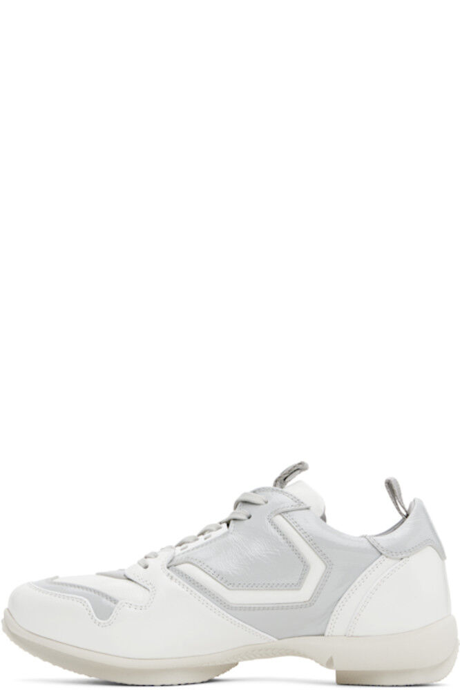 Низкие кроссовки из полированной кожи и лакированной телячьей кожи белого и серого цвета.