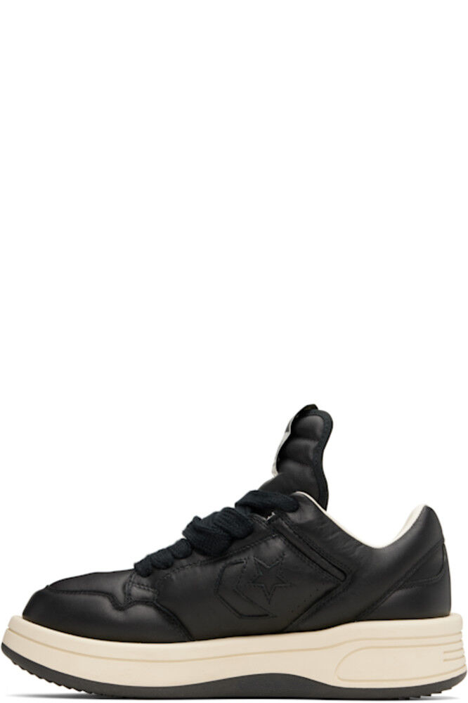 Низкие кроссовки из полированной кожи черного цвета. · Перфорированная отделка на носке и по бокам · Шнуровка · Флажок с логотипом на удлиненном мягком язычке · Мягкий воротник · Вырезы с логотипом по бокам · Подкладка из полированной искусственной кожи · Резиновая подошва с протектором · Платформа: высота 1,5 дюйма Часть коллаборации Rick Owens Drkshdw x Converse.