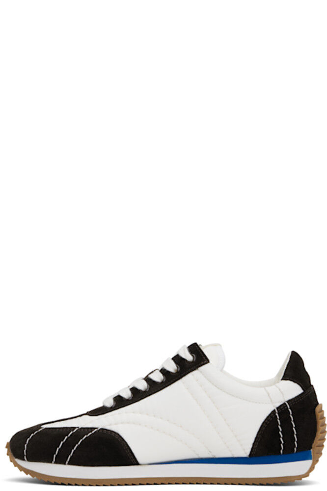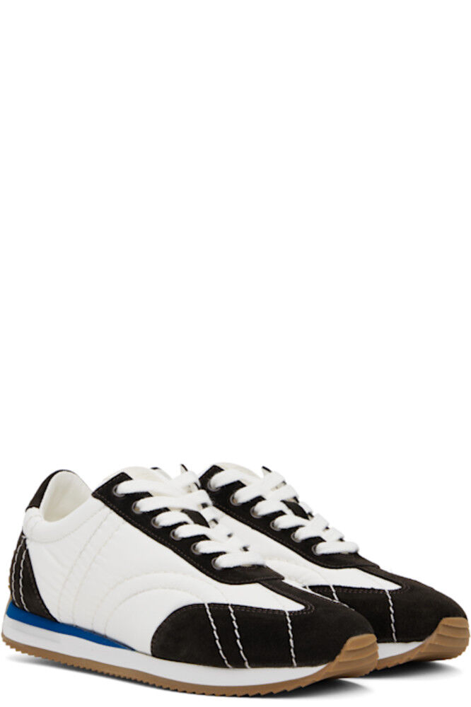 Низкие стеганые кроссовки из переработанного нейлона, тафты и замши белого и коричневого цветов.