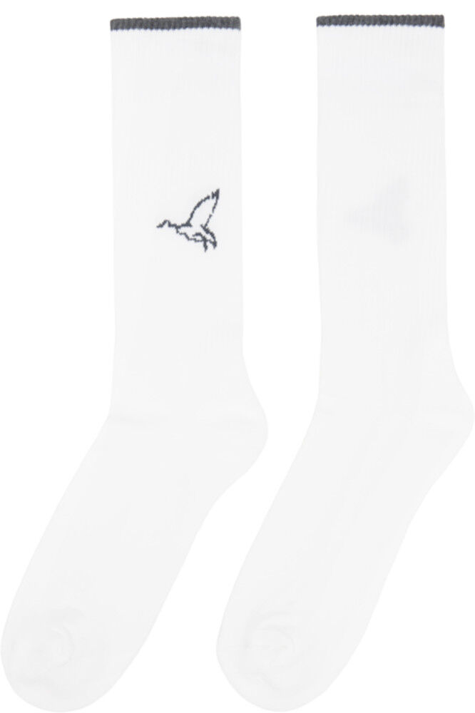 Пара носков из эластичного хлопкового трикотажа белого цвета.