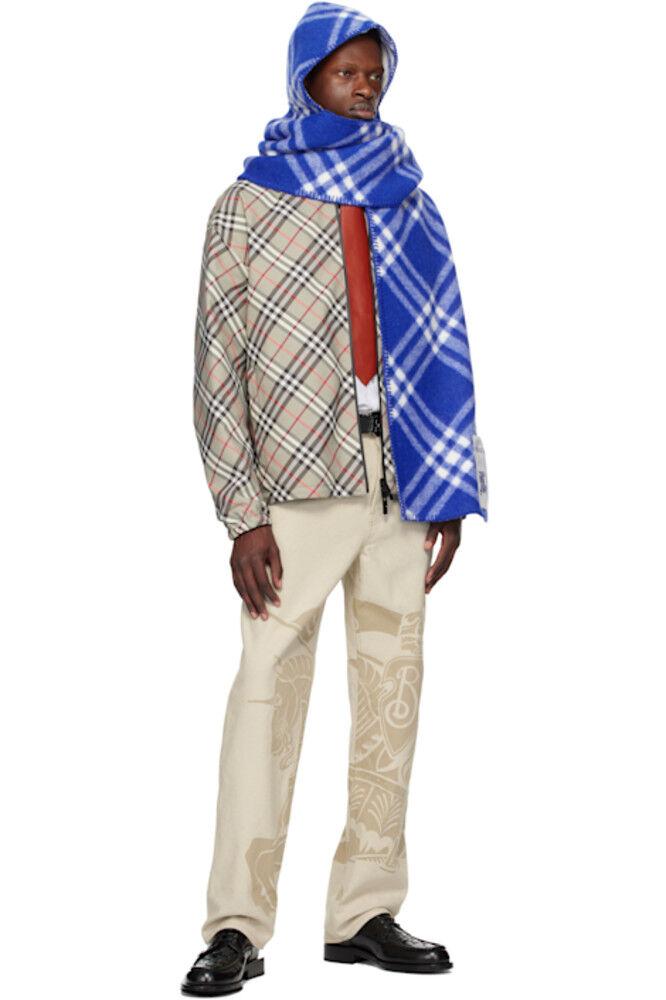 Прямоугольный двусторонний шерстяной шарф вязки синего цвета. Одеяло с узором в виде клетки и фирменным принтом по всему изделию.