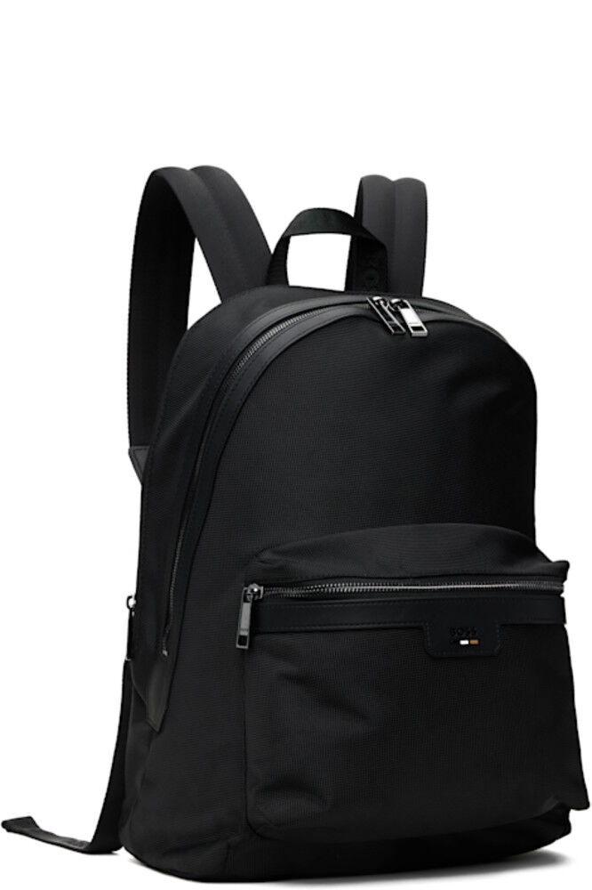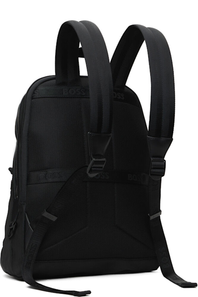 Рюкзак из холста черного цвета. · Отделка из полированной искусственной кожи по всей поверхности · Тканая ручка для переноски с логотипом · Регулируемые мягкие лямки · Тисненый логотип и аппликация в виде трехцветной полосы на лицевой стороне · Карман на молнии на лицевой стороне · Ремень для багажа на мягкой сетчатой задней стороне · Двусторонняя застежка-молния · Карман на молнии и накладные карманы внутри · Мягкое отделение для ноутбука · Подкладка из атласа с логотипом · Фурнитура цвета оружейной стали с гравировкой логотипа · В15" x Ш12" x Г6"