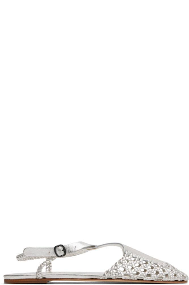 Сандалии из зернистой кожи ягненка, сотканные вручную, серебристого металлического оттенка.